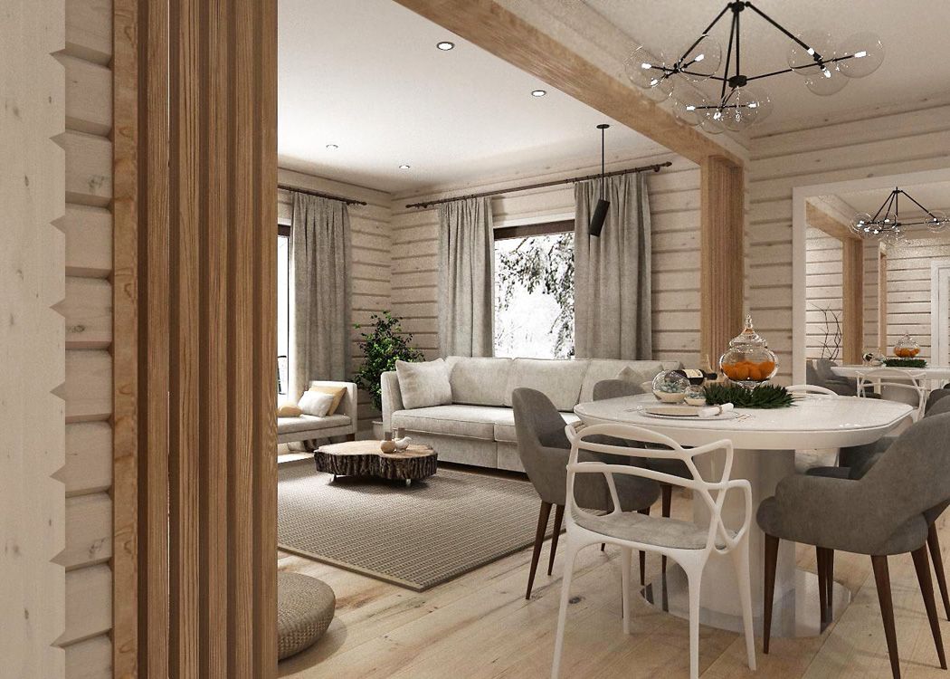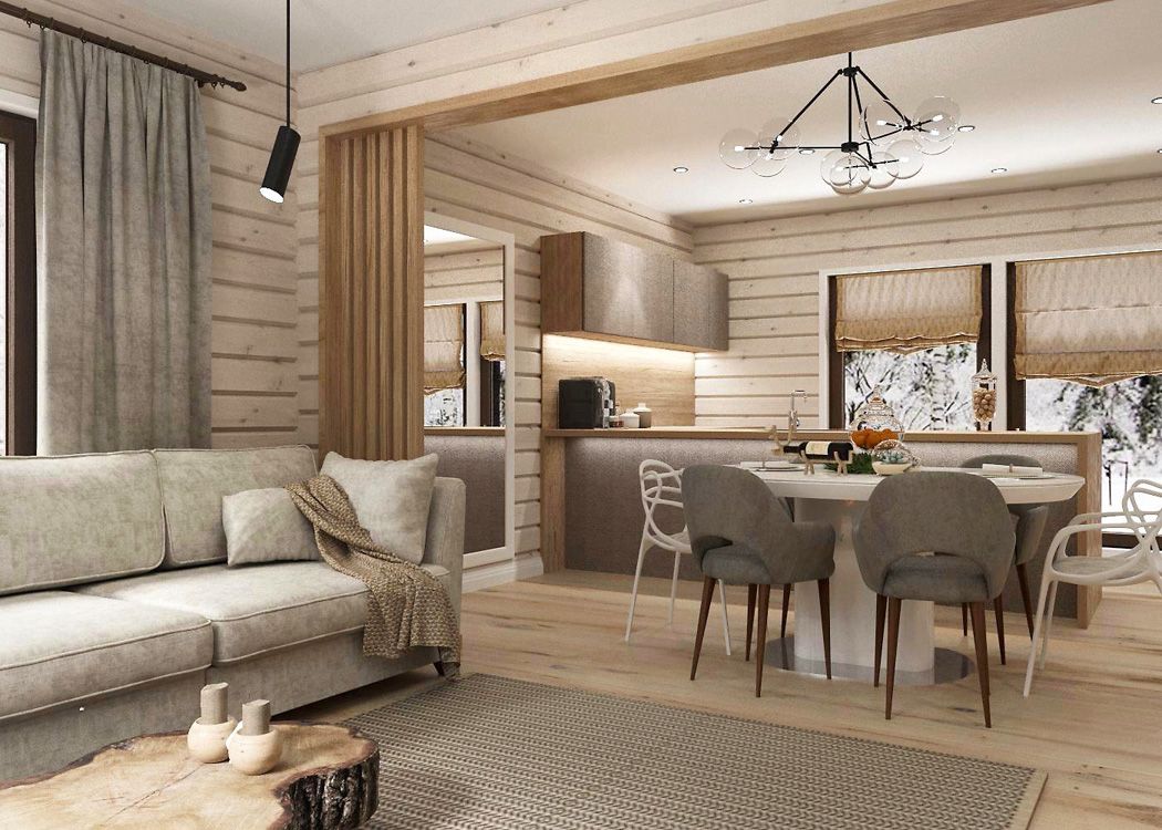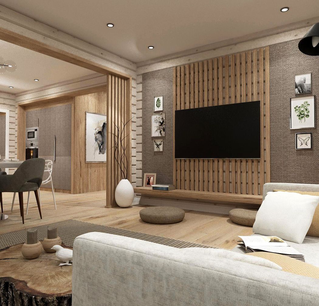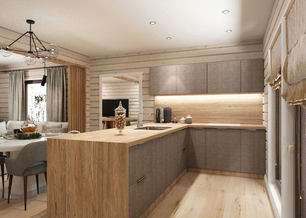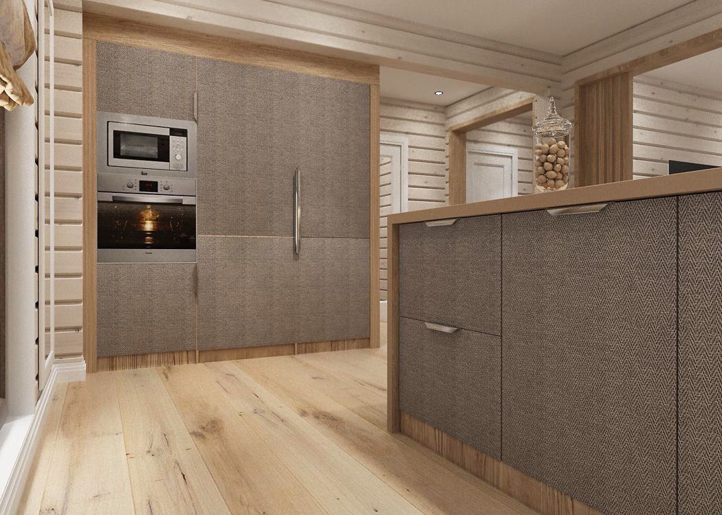 Камин облицован плитняком с нарочито грубой фактурой, чтобы подчеркнуть естественность природной стихии огня. Легкая перегородка из деревянных баффели переходит в декор за телевизором. Фактура стеновых панелей рядом с камином с выработкой под натуральный лен повторяется в кухонных фасадах. На фоне выбеленного фальшбруса — декоративные балки и элементы мебели в цвете «натуральный дуб». Единая полка у телевизора и камина объединяет эти два предмета в одну композицию. Журнальный столик — слэб дуба под стеклом — поддерживает брутальность облицовки камина.