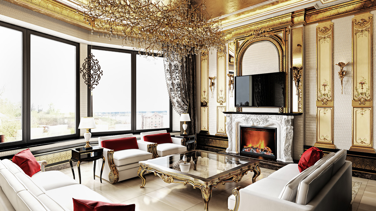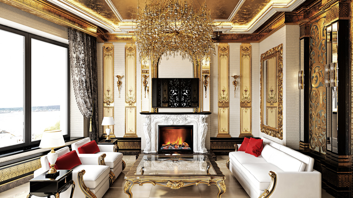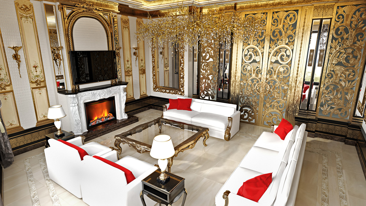 В соответствии с пожеланиями заказчика интерьер создан в подчеркнуто-роскошном стиле ар-деко. Блеск золота, щедрые орнаменты, дорогие современные материалы — все в доме призвано восхищать великолепием.