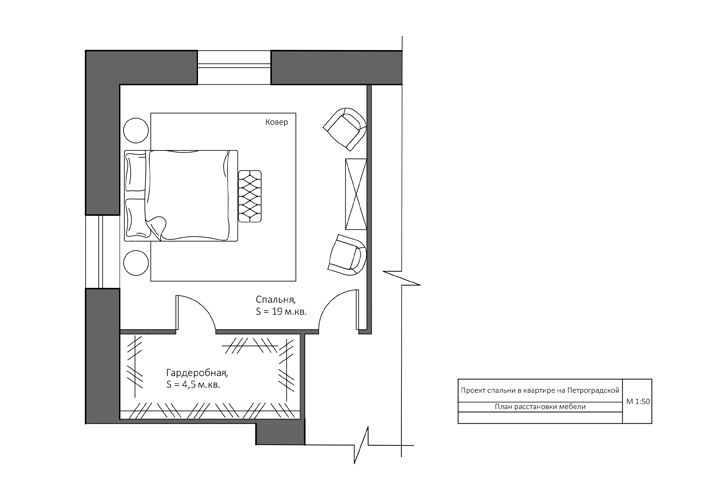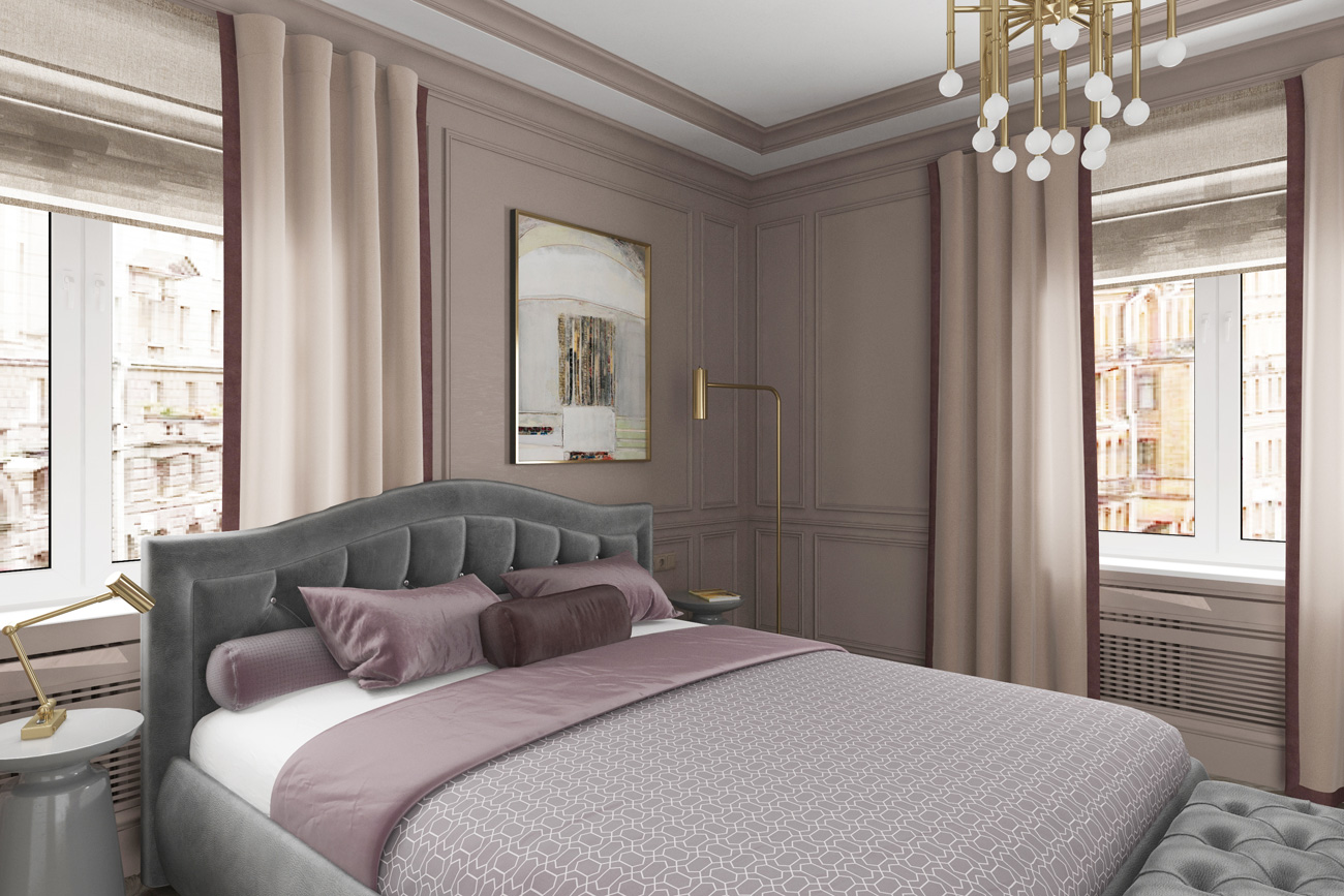 Спальня располагается в квартире в сталинском доме на Петроградской стороне в г. Санкт-Петербург.
