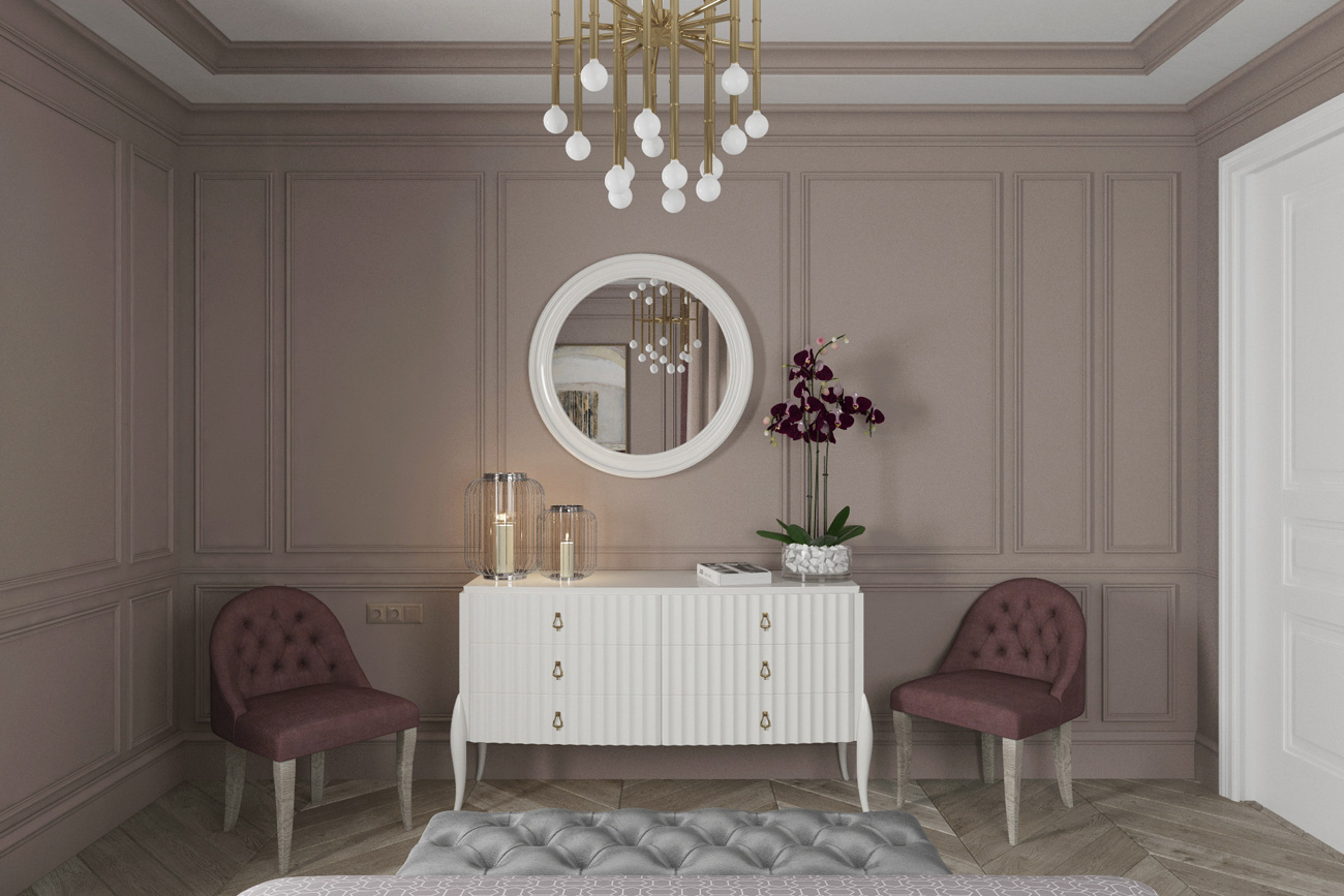 Заказчики – супружеская пара – хотели получить благородный, респектабельный и современный интерьер. Также влияние на стилевое направление проекта оказало место расположения и облик дома. Поэтому решено было взять классическую основу и наполнить ее современными деталями. Так, в интерьере появилась разбивка стен на зеркала, потолочная розетка, каретная обивка мебели и современные светильники с абстрактной картиной.