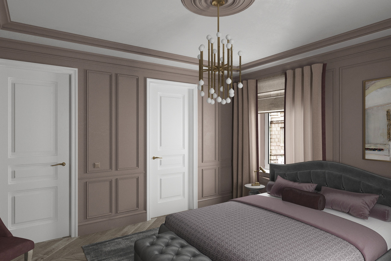 Благородства интерьеру добавил в том числе и высокий потолок, который решено было сделать двухуровневым с потолочным карнизом по периметру второго уровня, окрашенным в цвет стен. Также пространство квартиры позволило выделить удобную гардеробную, примыкающую к спальне.