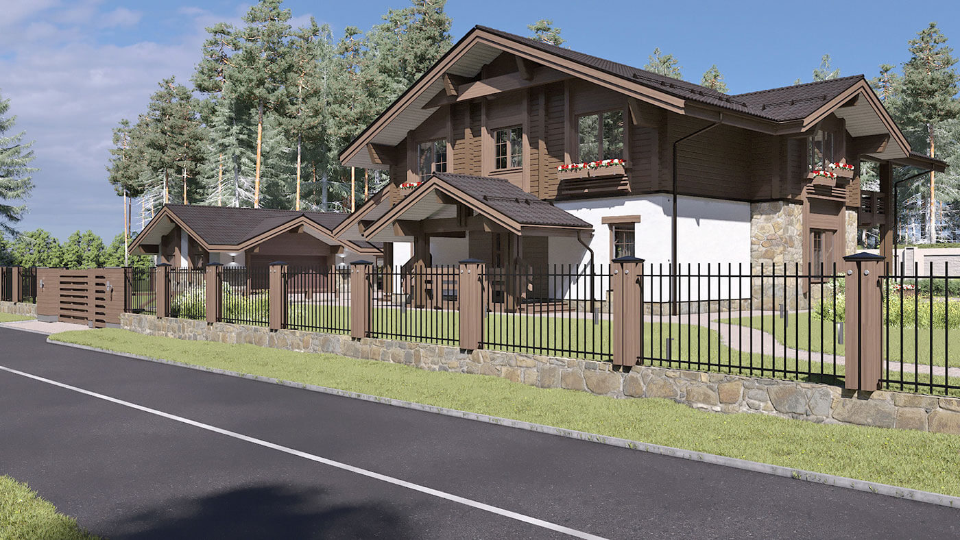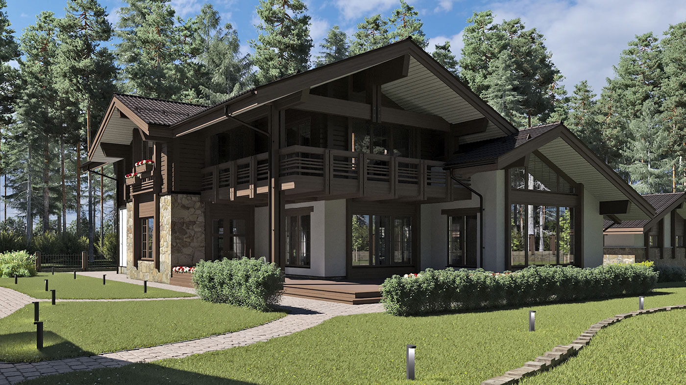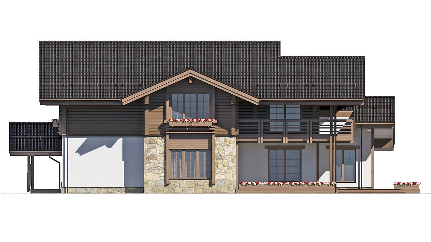 Комбинированный коттедж «Истра» — это традиционное шале в яркой авторской трактовке, максимально адаптированное под формат современного жилого дома. Первый этаж выполнен из керамических блоков с отделкой из камня, планкена и штукатурки под покраску, второй — из клееного бруса.