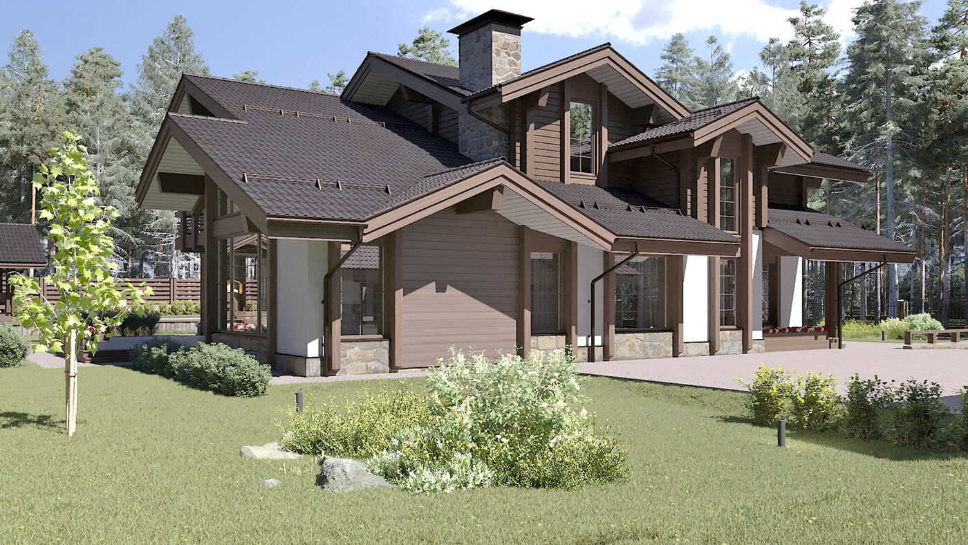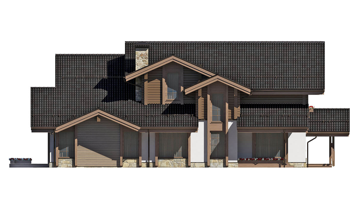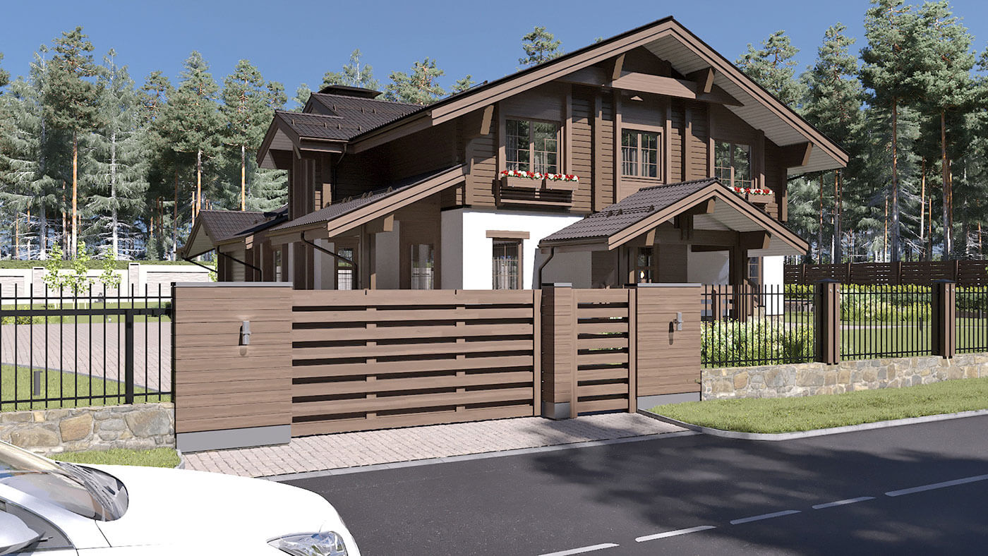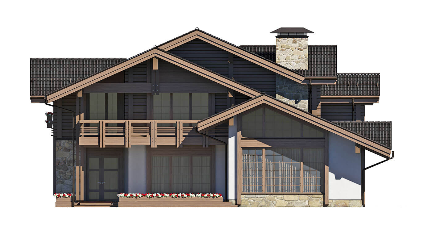 Комбинированный коттедж «Истра» — это традиционное шале в яркой авторской трактовке, максимально адаптированное под формат современного жилого дома. Первый этаж выполнен из керамических блоков с отделкой из камня, планкена и штукатурки под покраску, второй — из клееного бруса.