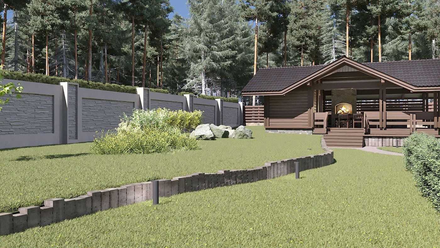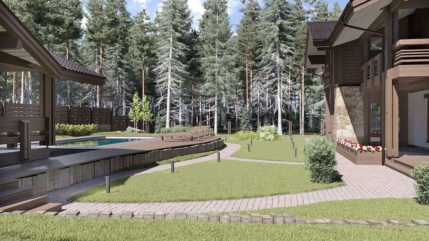 Общая площадь дома 324 кв.м, площадь первого «каменного» этажа — 186 кв.м, площадь мансардного деревянного этажа — 138 кв.м, площадь террас и балконов — 104 кв.м.