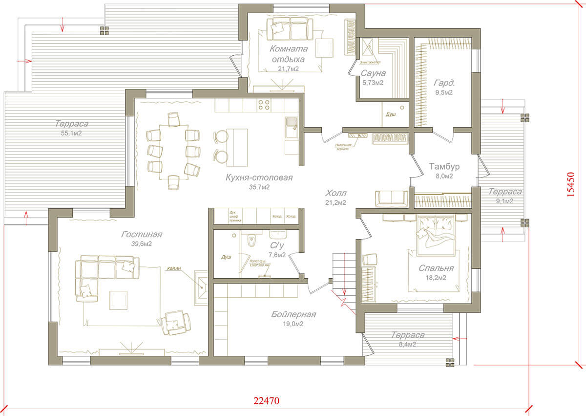 На первом этаже запроектировали гостевую спальню и банную зону, включающую комнату отдыха с парилкой и выходом на террасу. Гостиная с камином и просторная кухня-столовая — это центральная, доминантная часть дома, которая вынесена под отдельную кровлю и формирует «второй свет», что позволяет нам разместить в гостиной большой панорамный витраж, делая это помещение еще более воздушным и красивым.