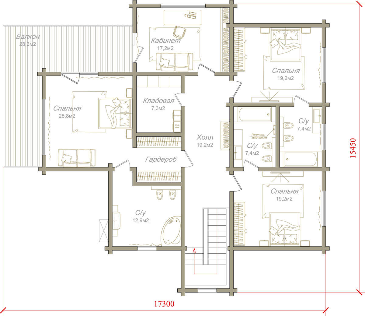 На втором этаже помимо жилой зоны, которая представляет собой два детских блока — спальня/санузел, хозяйскую спальню с гардеробной и просторным санузлом, также расположили кабинет и хозяйственную комнату.