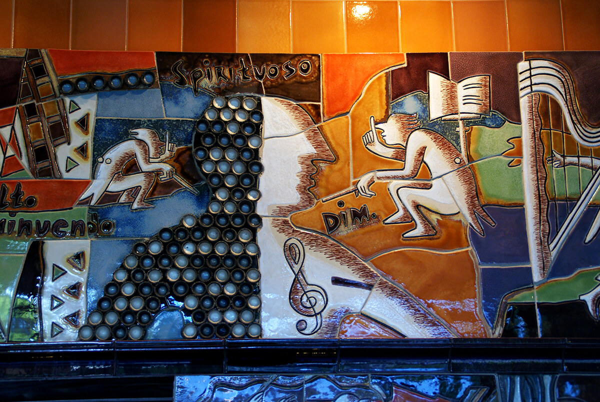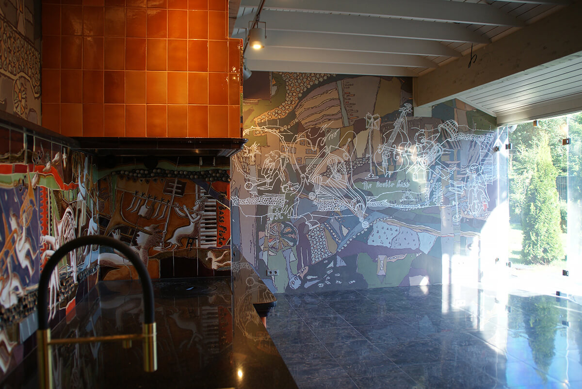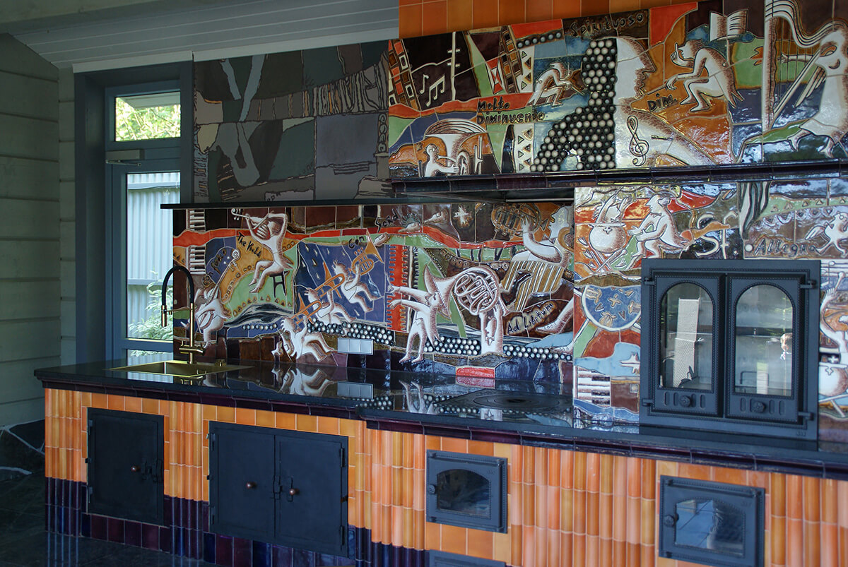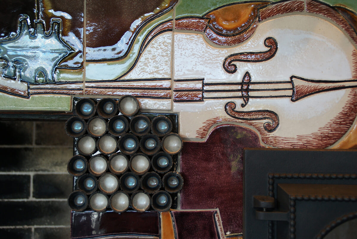 Тема веселого оркестра с юмористическим подтекстом была задана заказчиками — артистической семьей музыкантов. По их заданию печной комплекс должен был нести не только функциональную нагрузку, но и являться арт-объектом, создающим позитивное настроение и дающим повод к обсуждению в компании друзей-музыкантов.