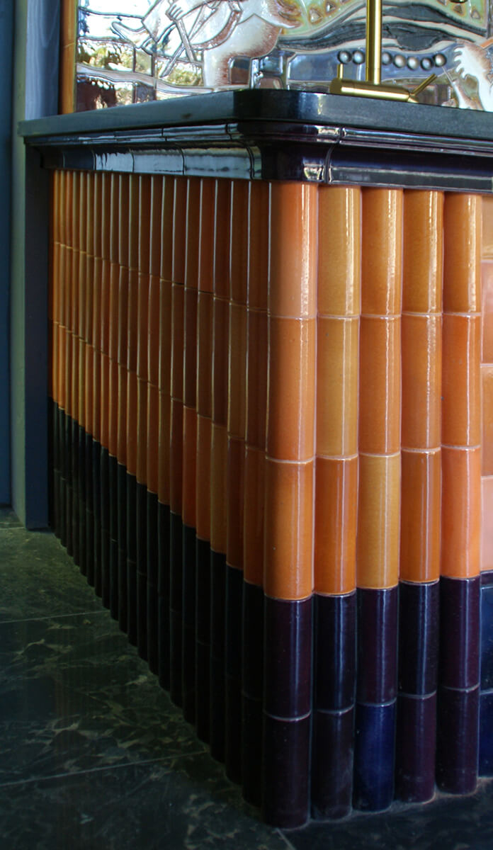 Комплекс выполнен из кирпича с облицовкой керамическими изразцами авторского дизайна и исполнения. Изразцы сделаны в технике росписи глазурями и подглазурными красками, также включают сложные рельефные керамические поверхности, созданные по авторским технологиям.