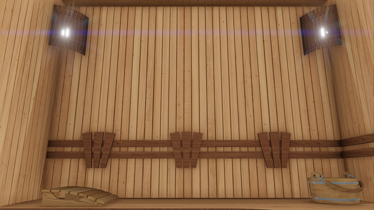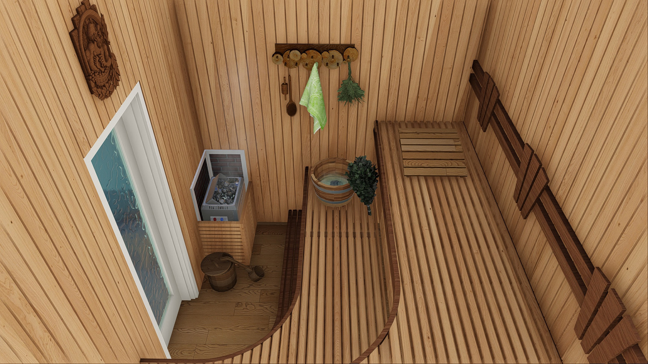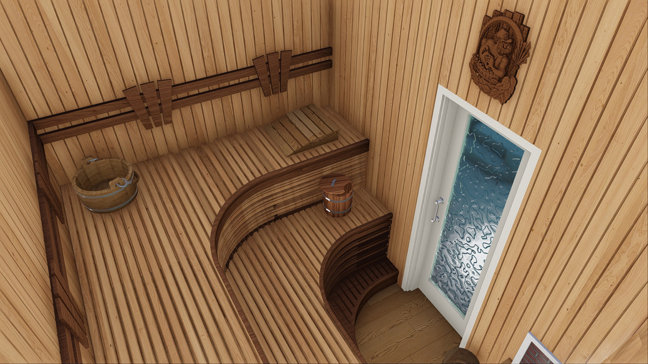 Помещение бани оборудовано электрокаменкой с парогенератором (для создания нужной температуры и влажности) и режимами работы «сауна» и «русская баня». Также предусмотрена возможность использования жидких ароматизаторов. Также имеются декоративные элементы, LED-освещение, термогигрометр и встроенное звуковое оформление. Одним из оригинальных элементов функционала и декора является обливное деревянное ведро-водопад. Материал отделки бани: липа и абаши.