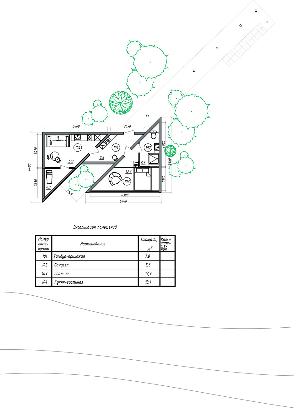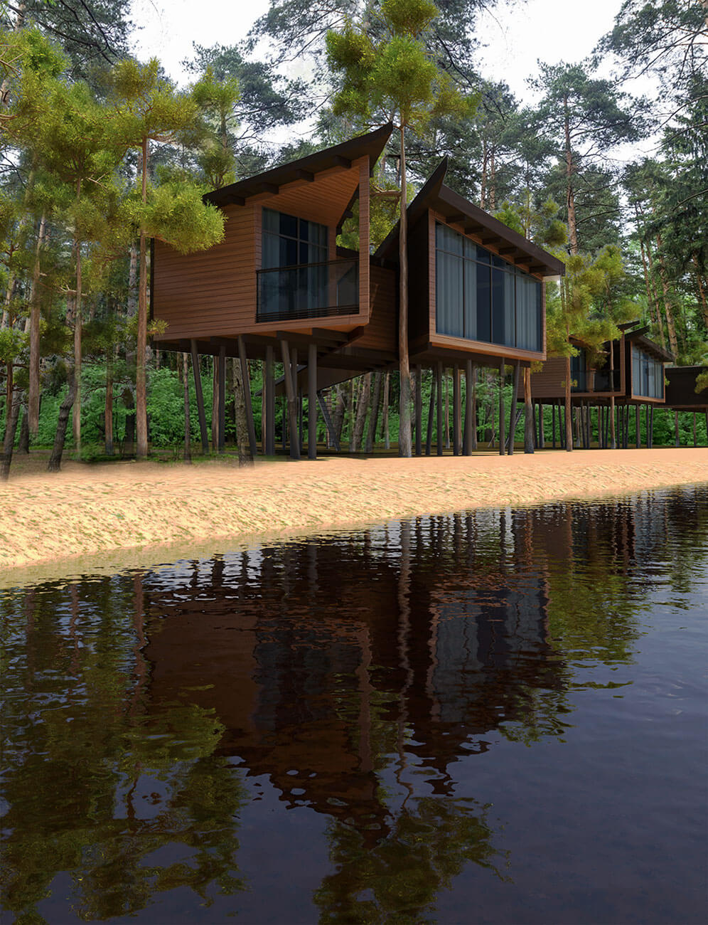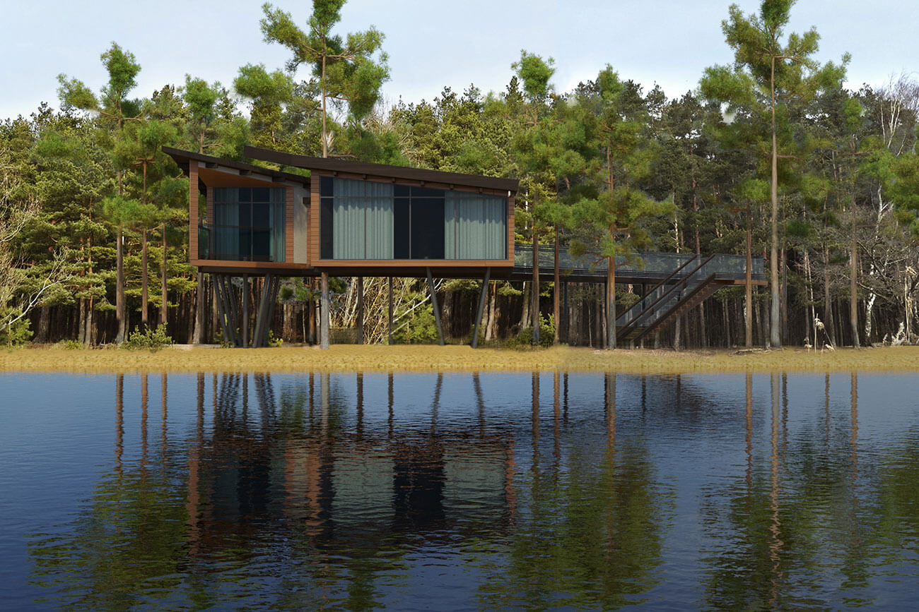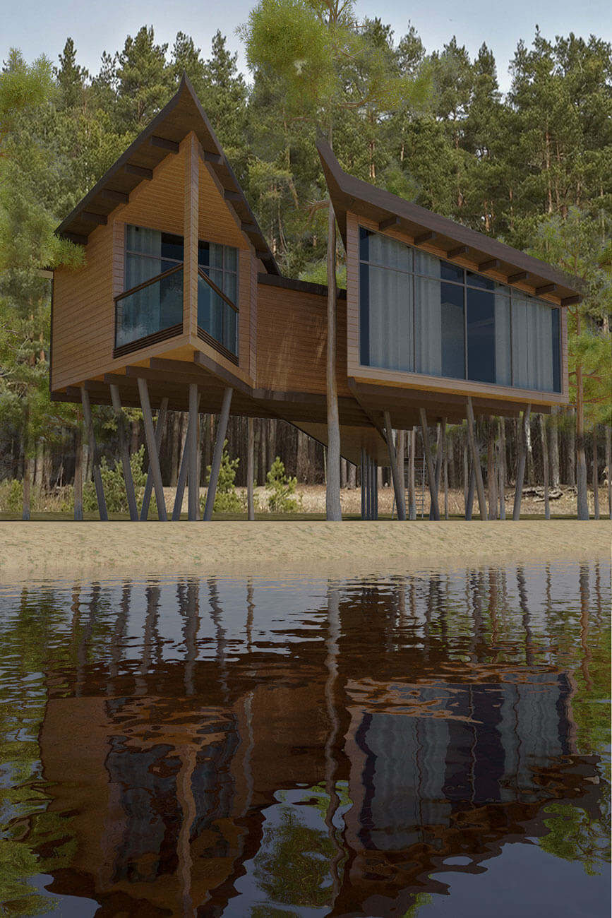 Концепция модульных каркасных деревянных домов предполагает строительство гостевых видовых апарт-отелей на опорах в местах водоохранных зон у берегов залива, озера, моря. Благодаря использованию опор, а не стационарных фундаментов, максимально нетронутыми сохраняется многолетняя и вековая корневая система сосен, елей, лиственных деревьев. По концепции здание состоит из двух треугольных модулей, соединенных между собой обшитым теплым переходом (входная зона), что позволяет раздвигать и двигать модули в любом направлении, в зависимости от расположения высоких деревьев, тем самым компонуя объем вокруг природы, интегрируя дома в саму природу. Витражные остекления и терраса позволяют максимально наслаждаться спокойствием воды и умиротворением побережья. Дома одноэтажные, рассчитанные на 1-2 семьи. Ко входу ведет открытая галерея с одномаршевой лестницей.