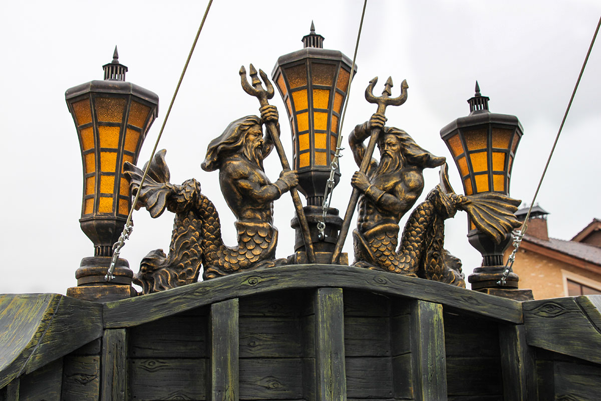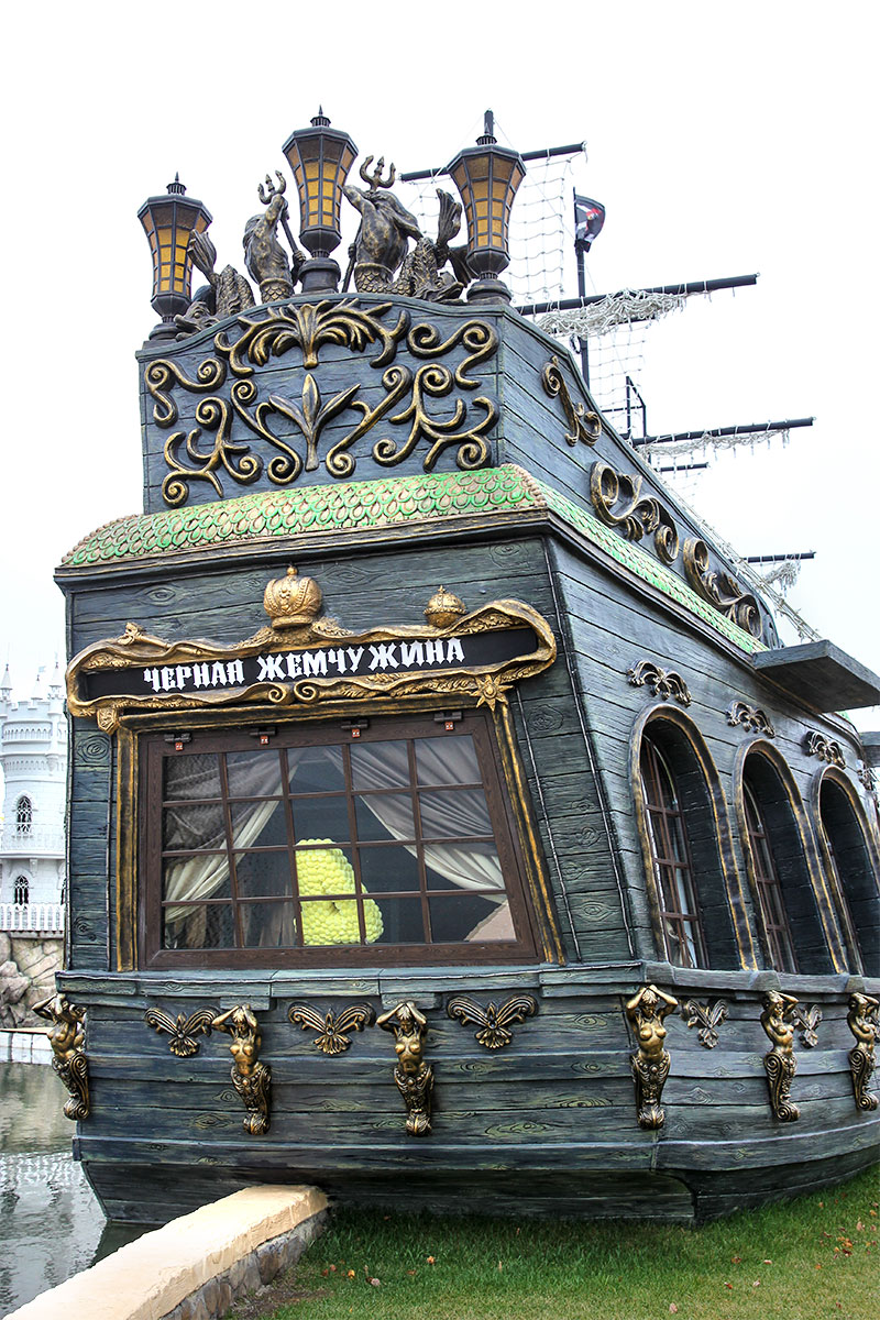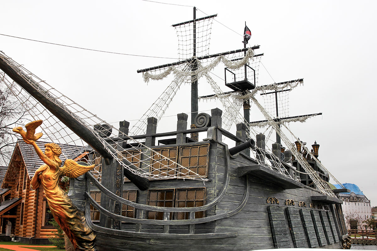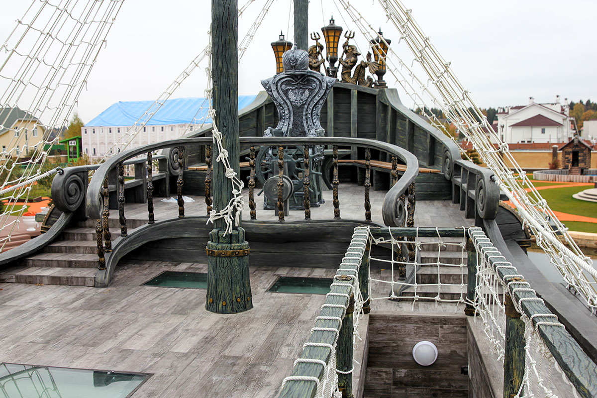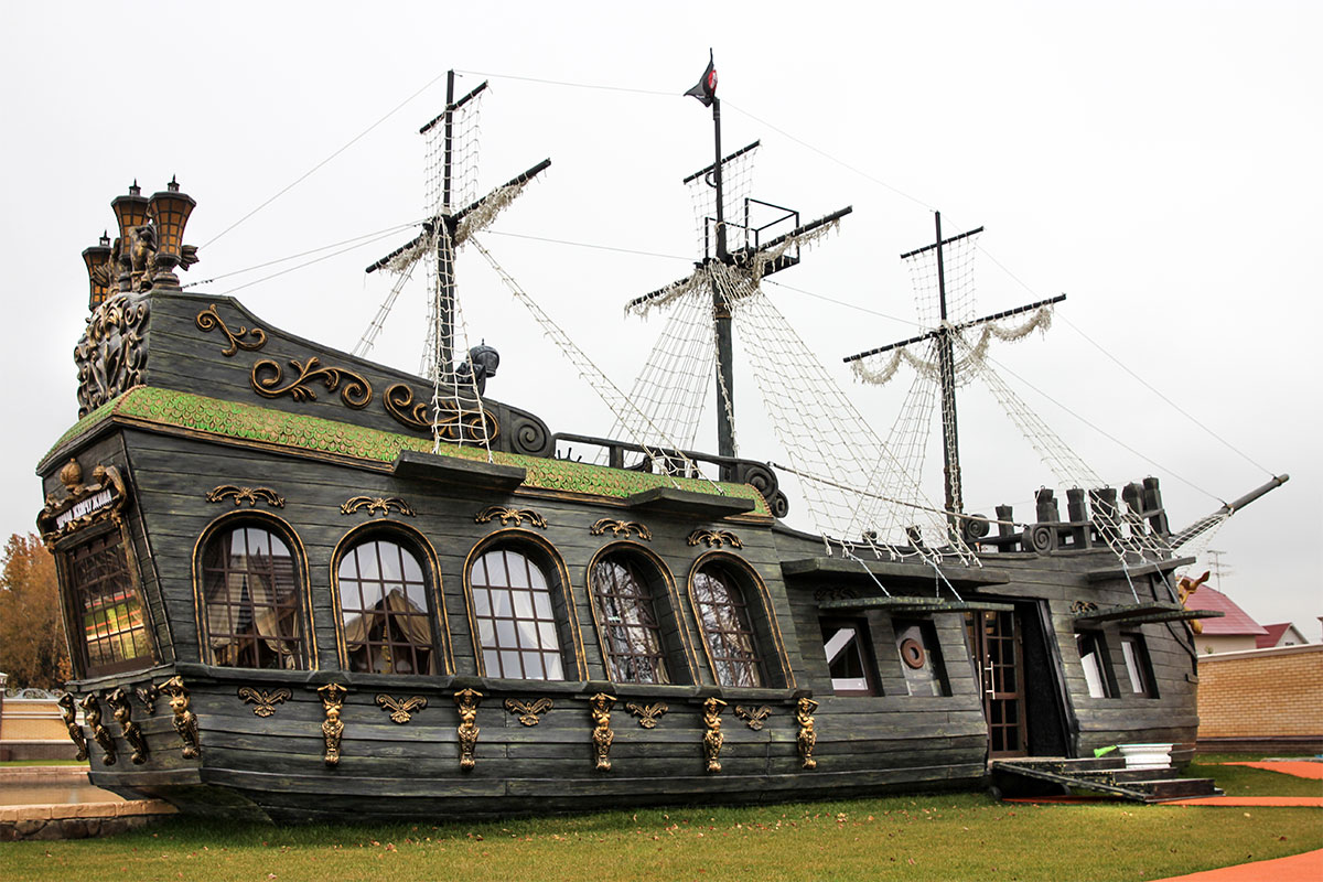 Прототипом художественной идеи выступил пиратский корабль «Черная жемчужина» из фильма «Пираты Карибского моря». За функциональную основу положен комплекс из двух палуб корабля. Нижняя первая палуба — гостиная или мини-ресторан, кухня с барбекю, печью, тандыром. Верхняя вторая палуба — место для игр, загорания, лазания по канатам, фотографирования и наблюдения за окрестностями с высоты.