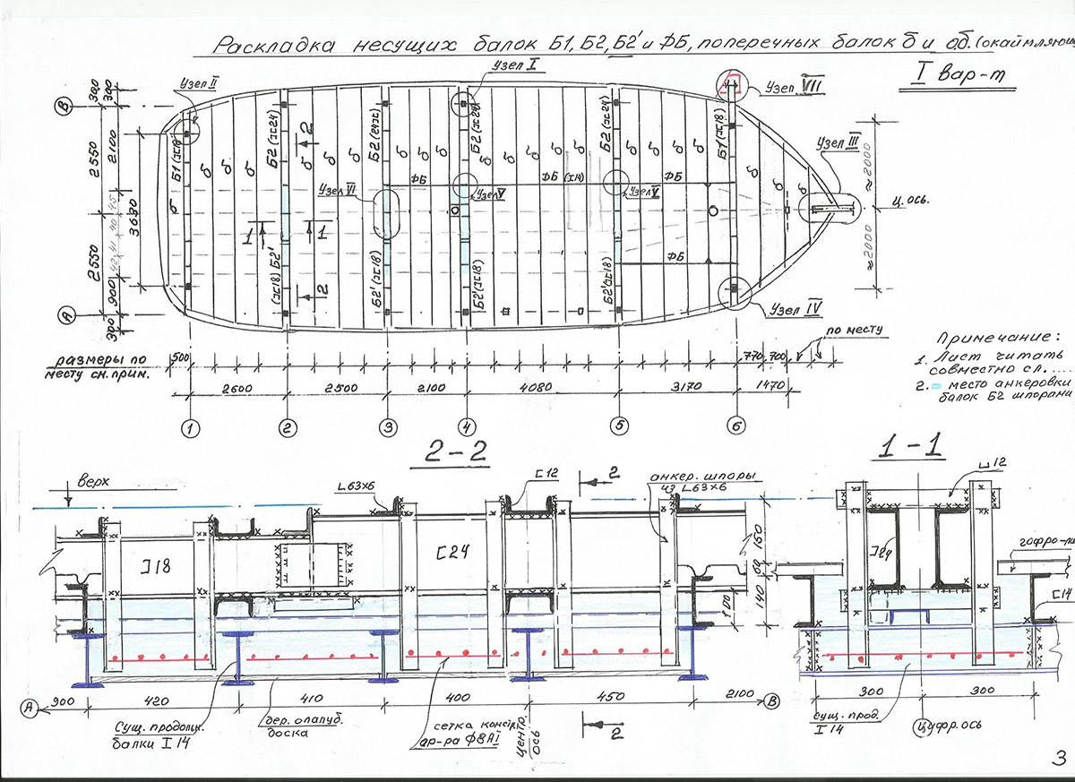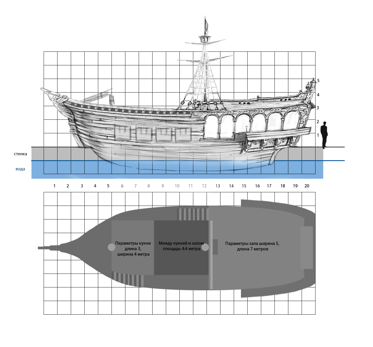 Основная идея композиции: вписать в береговую линию водоема комплекс, выполненный из металлокаркаса и бетона в соотношении 2/3 на суше и 1/3 над водой. Требовалось сохранить внешнюю легкость и правдоподобность впечатлений пришвартованного реального корабля для несвойственной этому функционалу и тяжелой по конструкции и весу монументальной композиции.