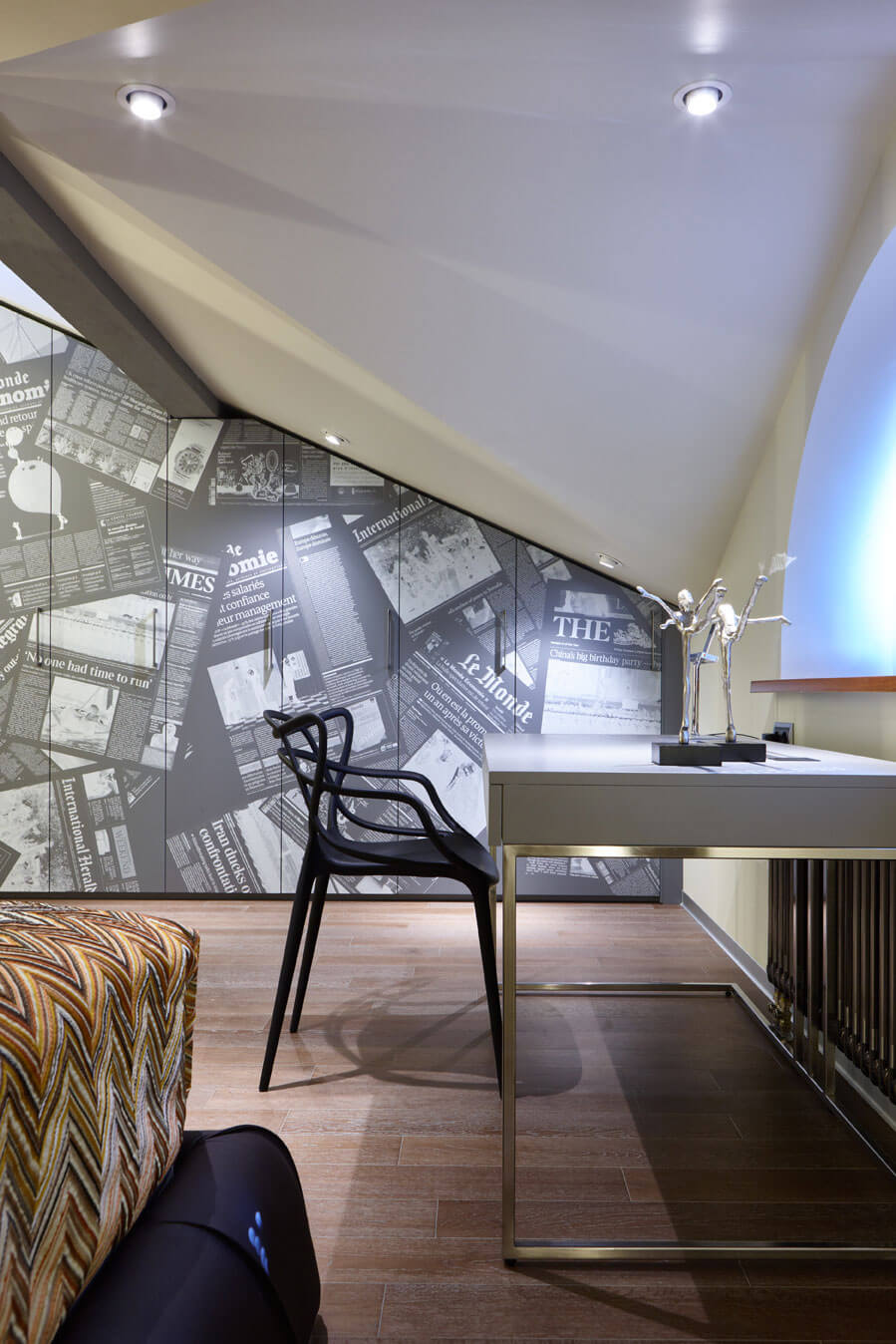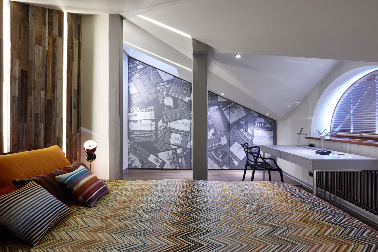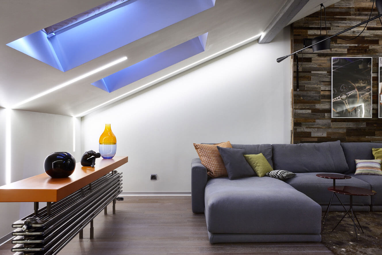 Это проект яркой мансарды для молодого человека, где сложная ломаная геометрия крыши стала отправной точкой для планирования освещения. Основной световой сценарий построен на встроенных гипсовых световых линиях. Они буквально «перетекают» с потолка на стены, стирая привычные границы между поверхностями и визуально гармонизируя непростую форму помещения.