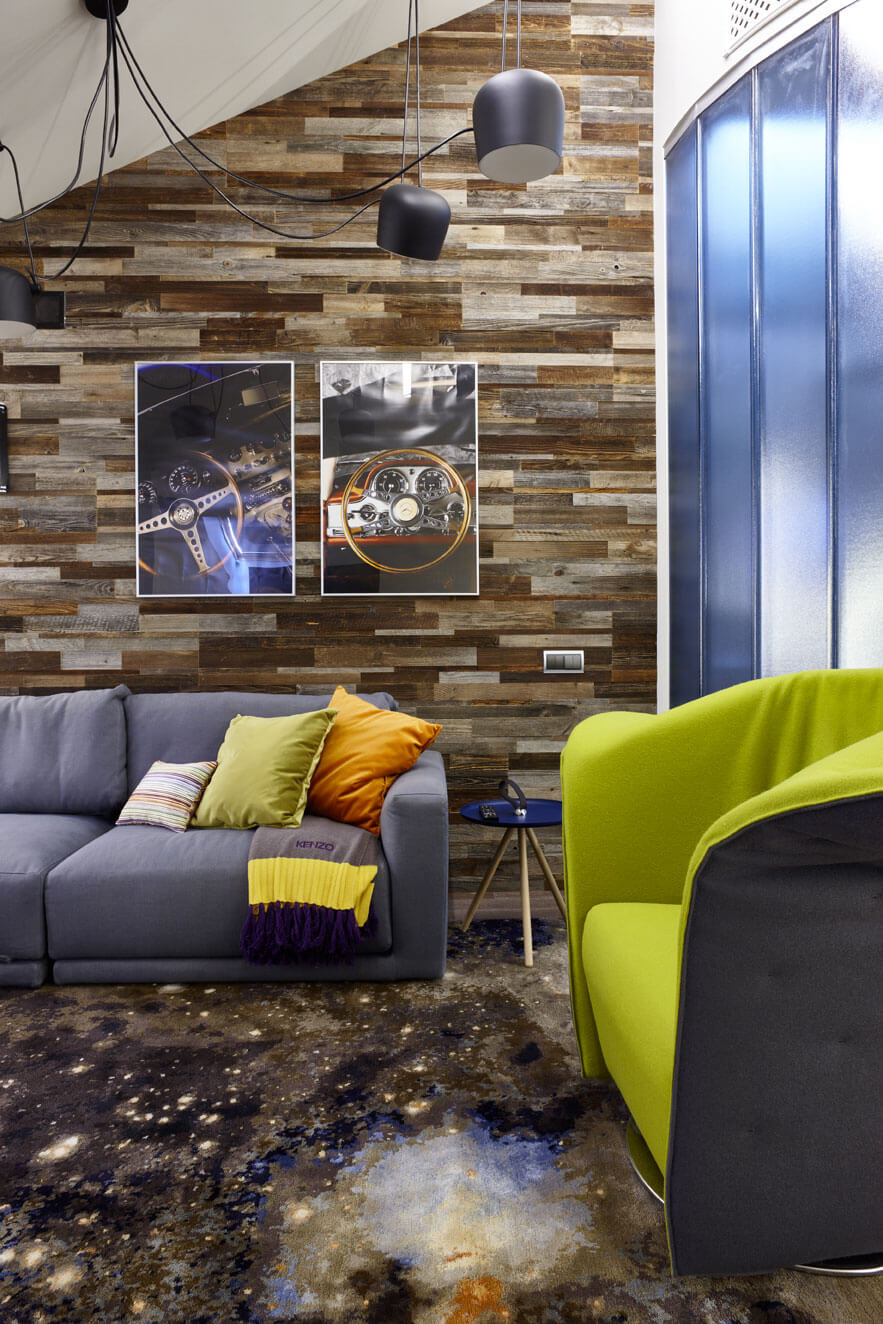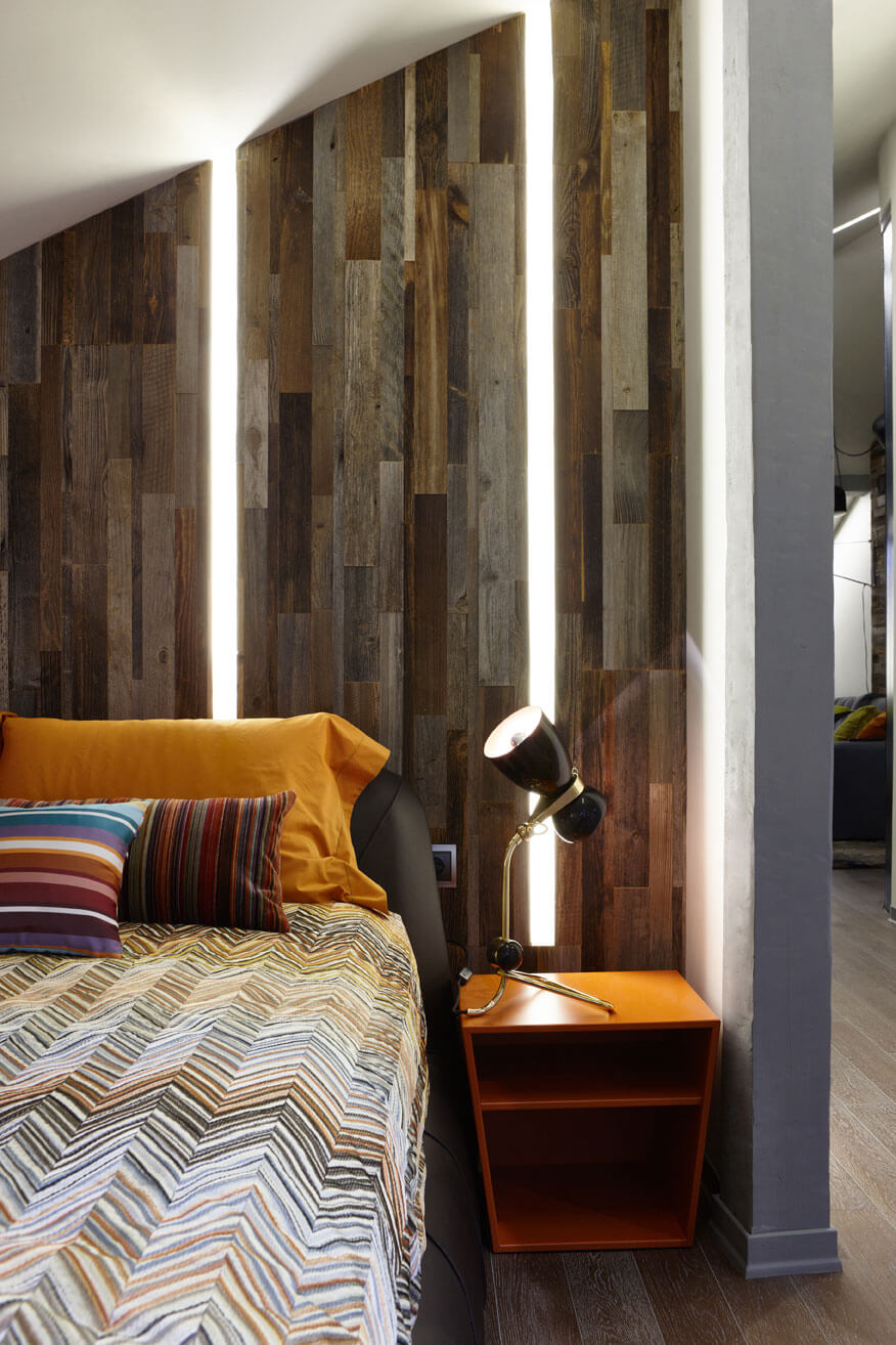 Функциональность и индустриальная эстетика соединились в радиаторе отопления, который со встроенной столешницей выполняет роль консоли или скамьи. Стену за диваном отделали натуральными деревянными панелями, а скос под крышей, кажущийся глухой стеной, на самом деле является системой вместительных встроенных шкафов.