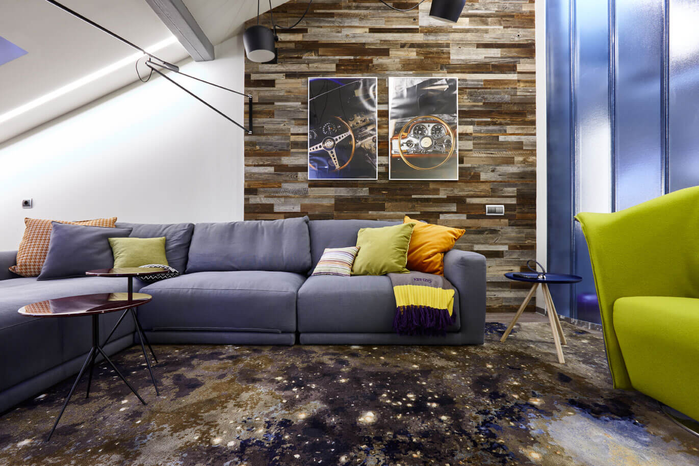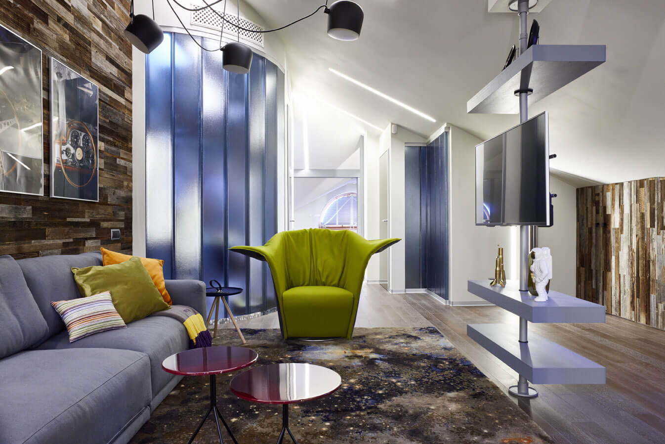 Динамику и настроение задают акцентные элементы: эффектные столики-скульптуры, ковер с изображением галактики и композиция из подвесных светильников — вместе они создают ощущение вращения в космической бесконечности, усиливая игривый и современный дух пространства.