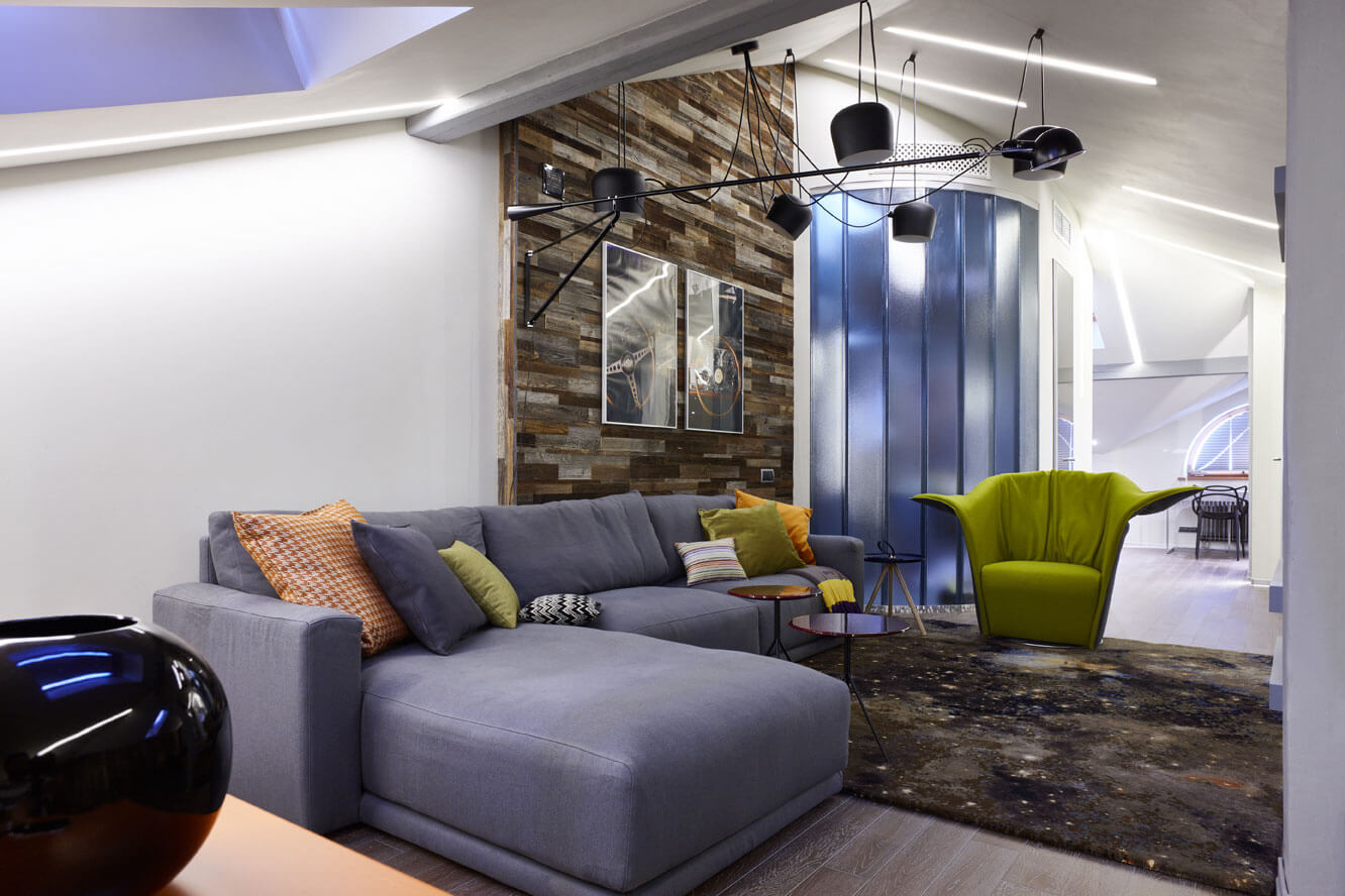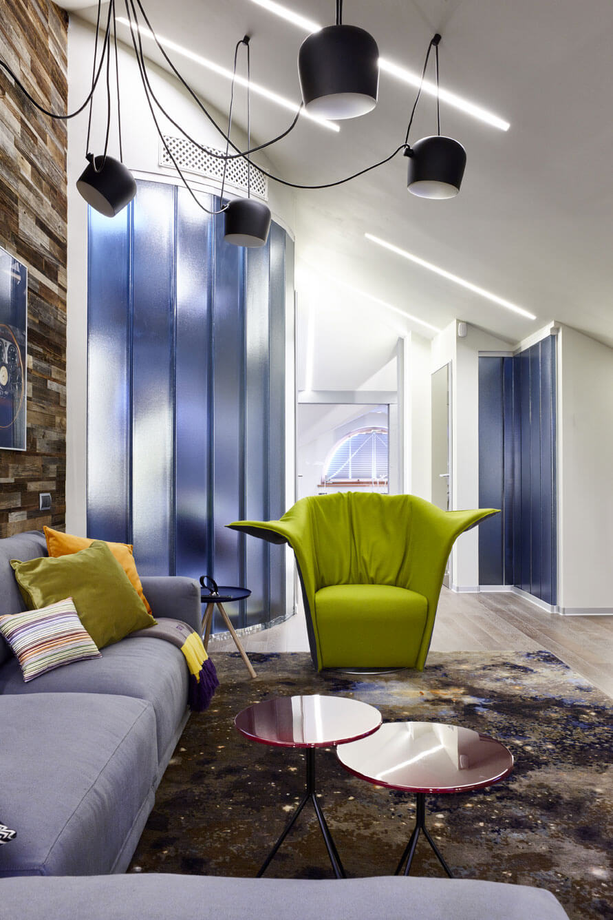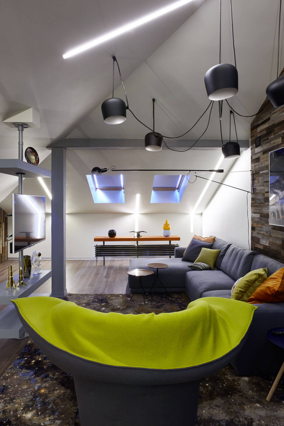 Над лаунж-зоной расположены регулируемые подвесные светильники — это акцентное освещение, позволяющее легко менять атмосферу в комнате. Принцип мобильности и гибкости прослеживается и в мебели: телевизор установлен на мобильной ТВ-стойке, а «кресло Фродо» служит прекрасным примером трансформации. Оно не только вращается, но и меняет форму спинки по высоте и объему, превращаясь из уютного кокона в импозантный трон.