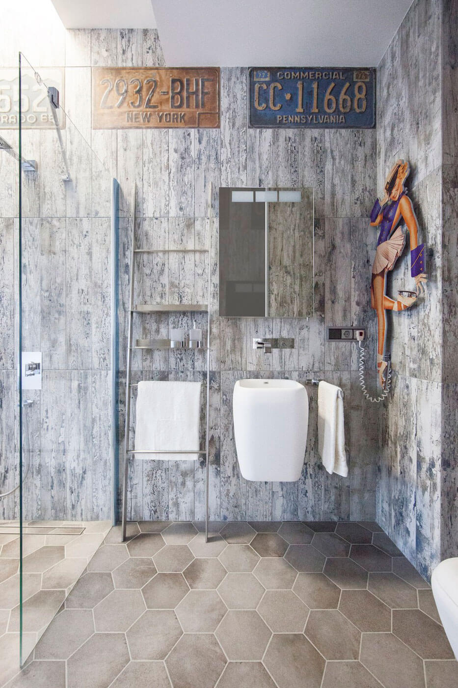 Стеклянные перегородки из профилированного стекла (профилита) подчеркивают индустриальный стиль и зрительно увеличивают пространство. Это решение имеет и практическую пользу: в санузел и душевую проникает естественный дневной свет.