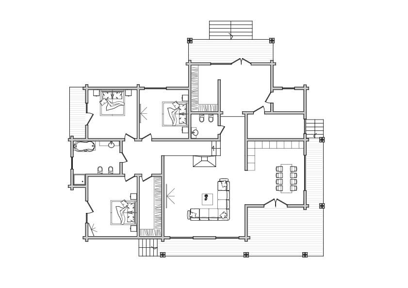 Это просторный дом для большой семьи. Просторная гостиная интегрирована с кухонной зоной, которая может при необходимости отделиться раздвижной перегородкой. Гостиная с камином и просторная кухня-столовая — это центральная, доминантная часть дома, которая вынесена под отдельную кровлю и формирует второй свет, что позволяет нам разместить в гостиной большой панорамный витраж, делая это помещение еще более воздушным и красивым. Спальная зона вынесена в отдельную, где помимо трех спален, расположены ванная и гардеробная.