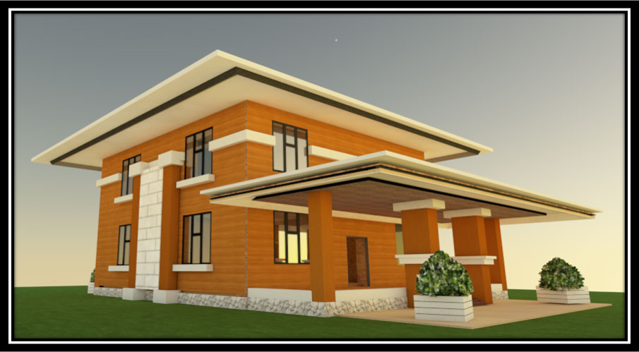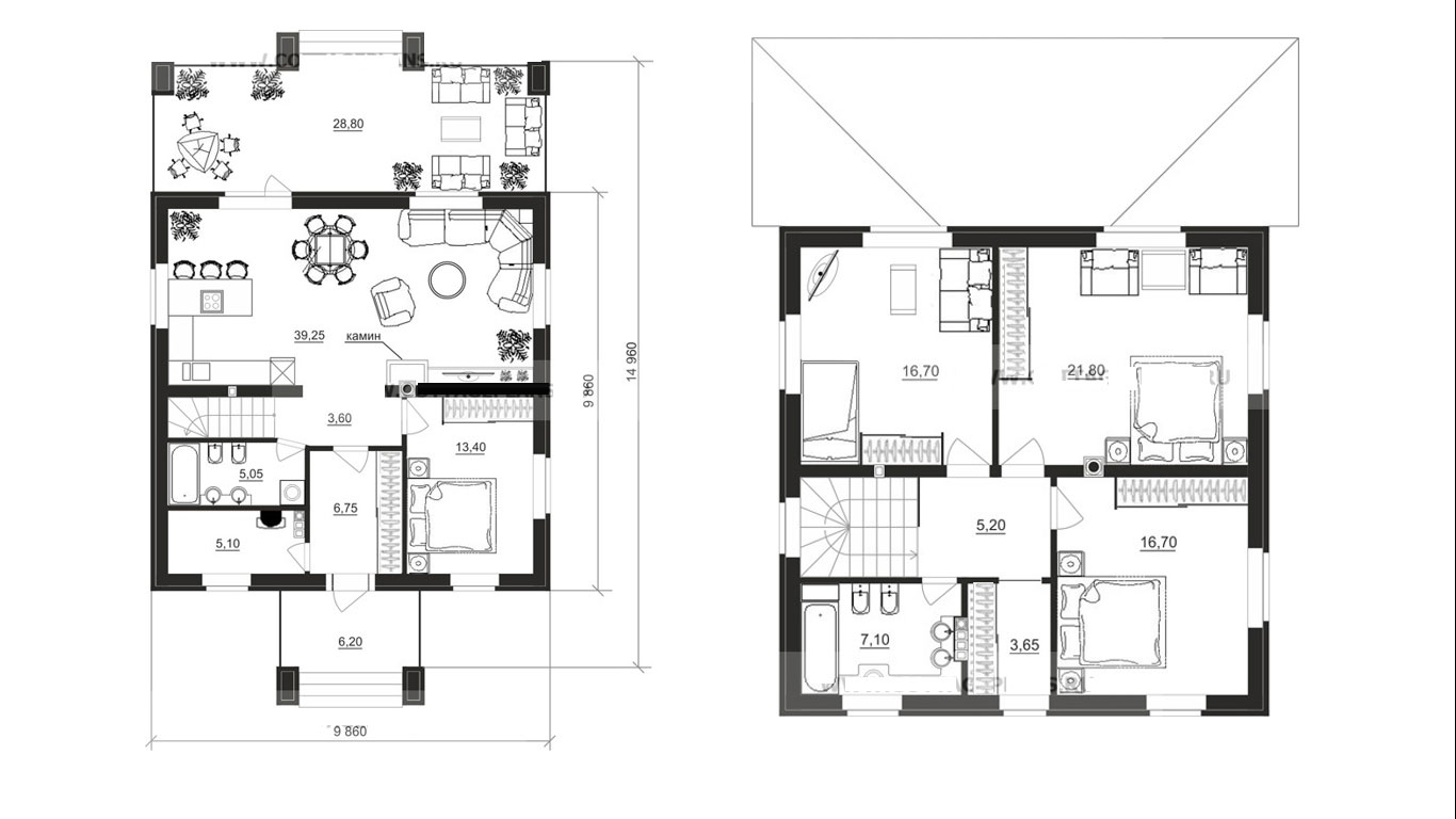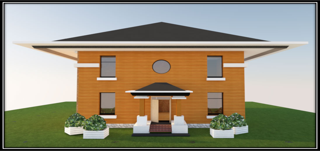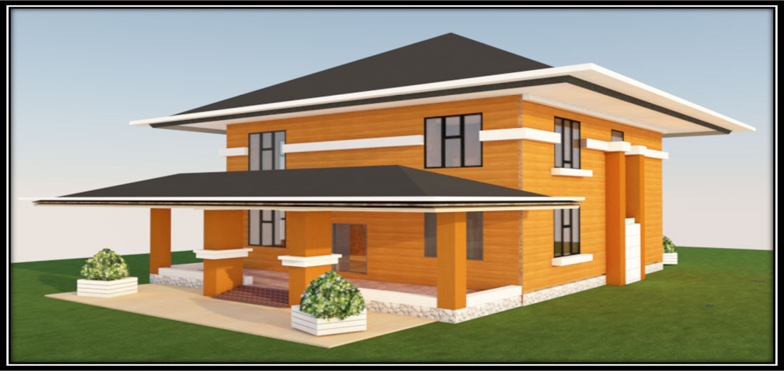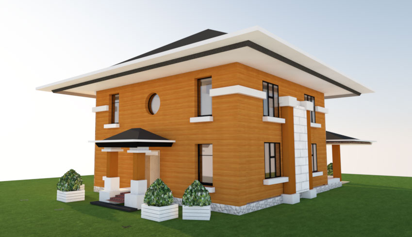 Проект коттеджа представляет собой здание с двумя этажами. Площадь дома составляет 141.7 м². Коттедж предназначен для комфортного круглогодичного проживания семьи из 4 и более человек. Планировка помещений открытая. Первый этаж включает в себя большую гостиную, совмещенную с кухней и спальню. В состав вспомогательных помещений входят прихожая, котельная и санузел. Второй этаж представляет собой 3 спальни и санузел. Также дом включает в себя открытую террасу.