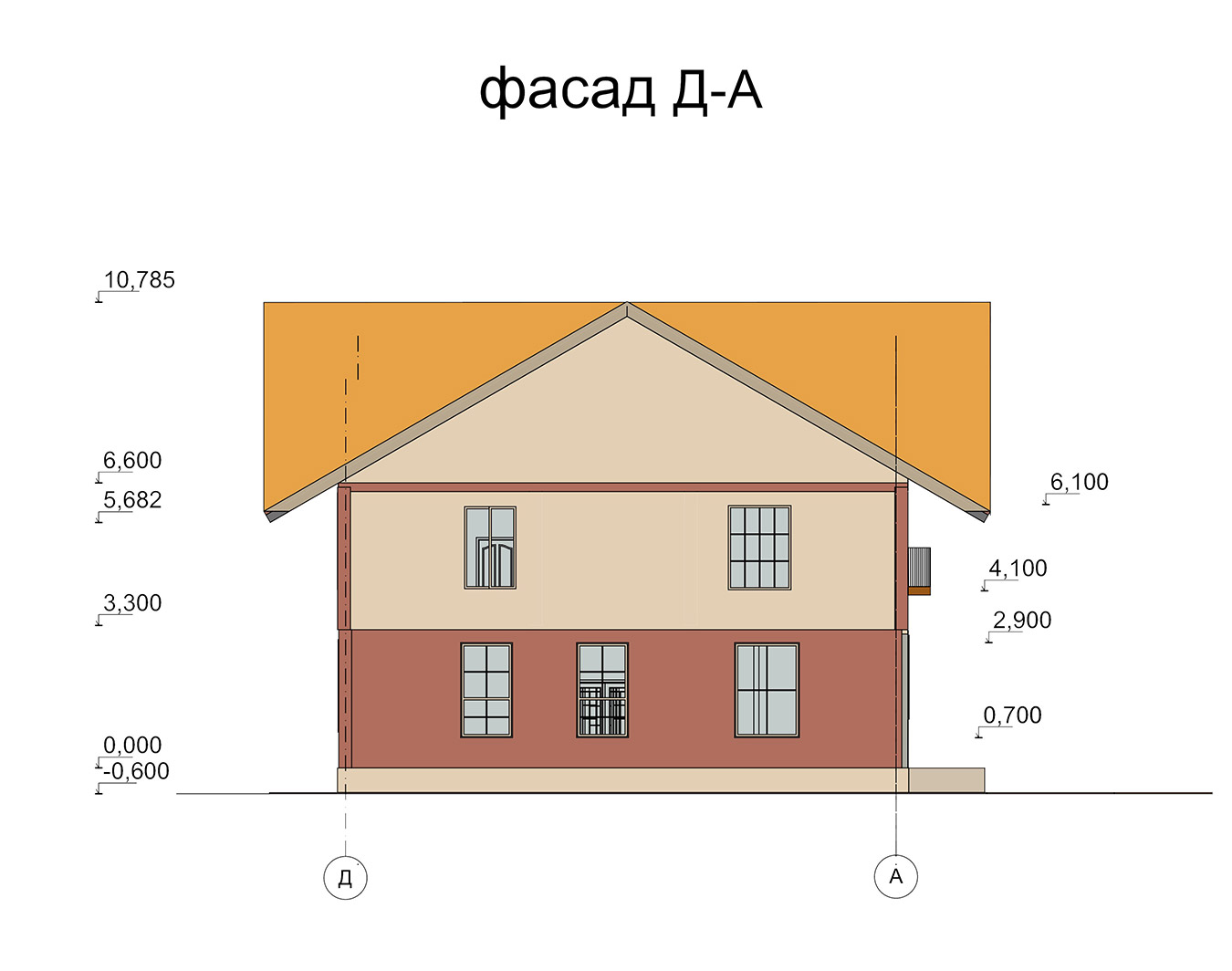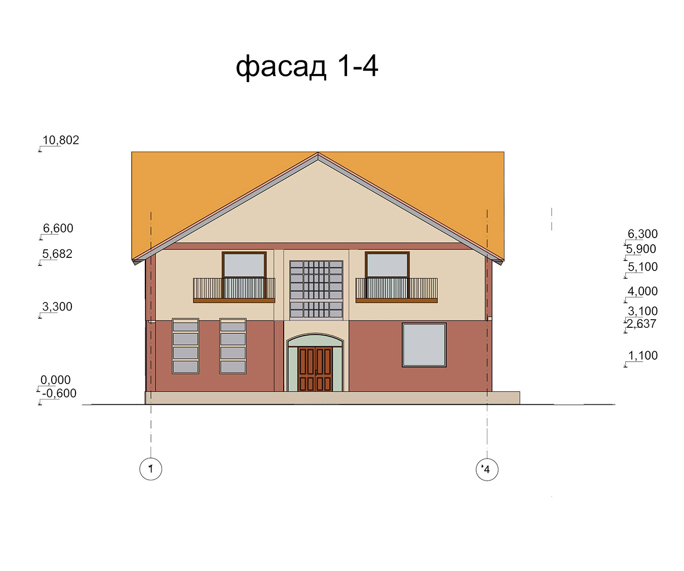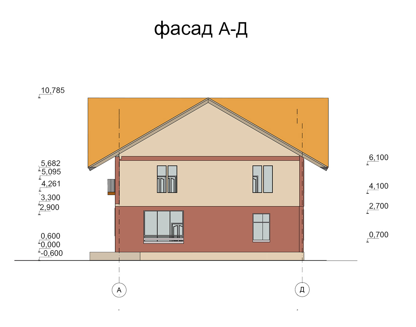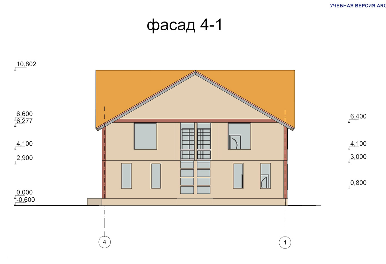 Двухэтажный коттедж размерами 12 300 х 12 000 м. Стены сложены из газобетонных блоков. Для отделки фасада используются штукатурка и декоративный камень. Перекрытия монолитные железобетонные. Теплая кровля покрыта металлочерепицей.