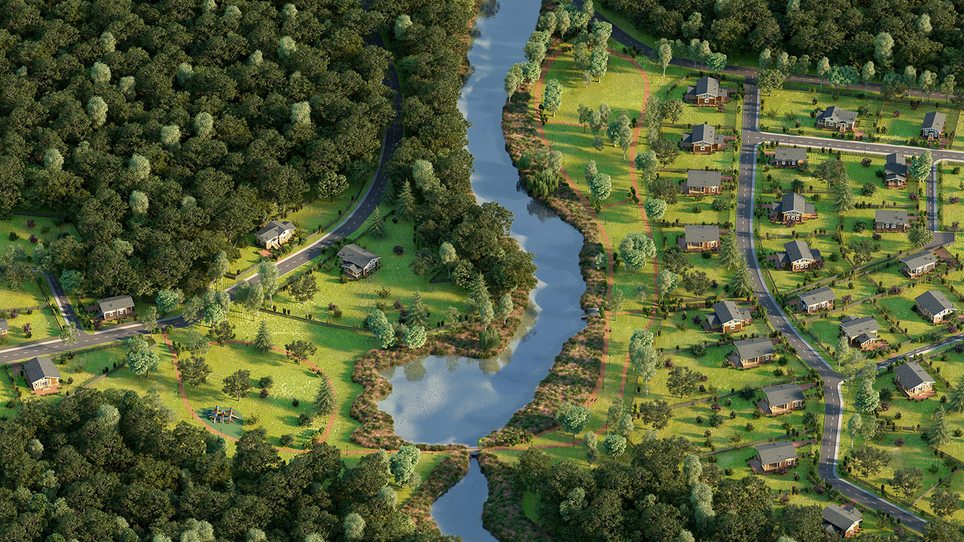 Живописный рельеф, отличные видовые характеристики участка и небольшая речка являются хорошей основой для создания комфортного загородного поселка.