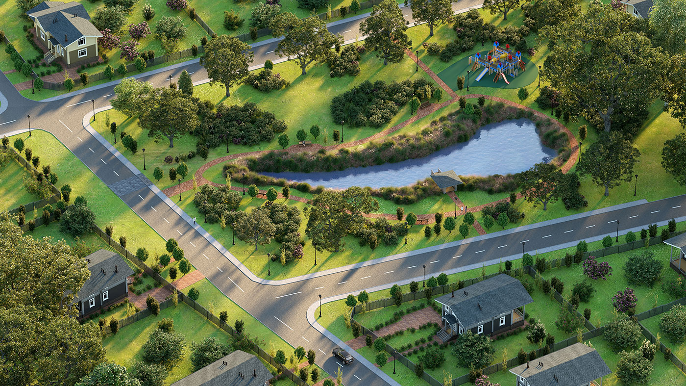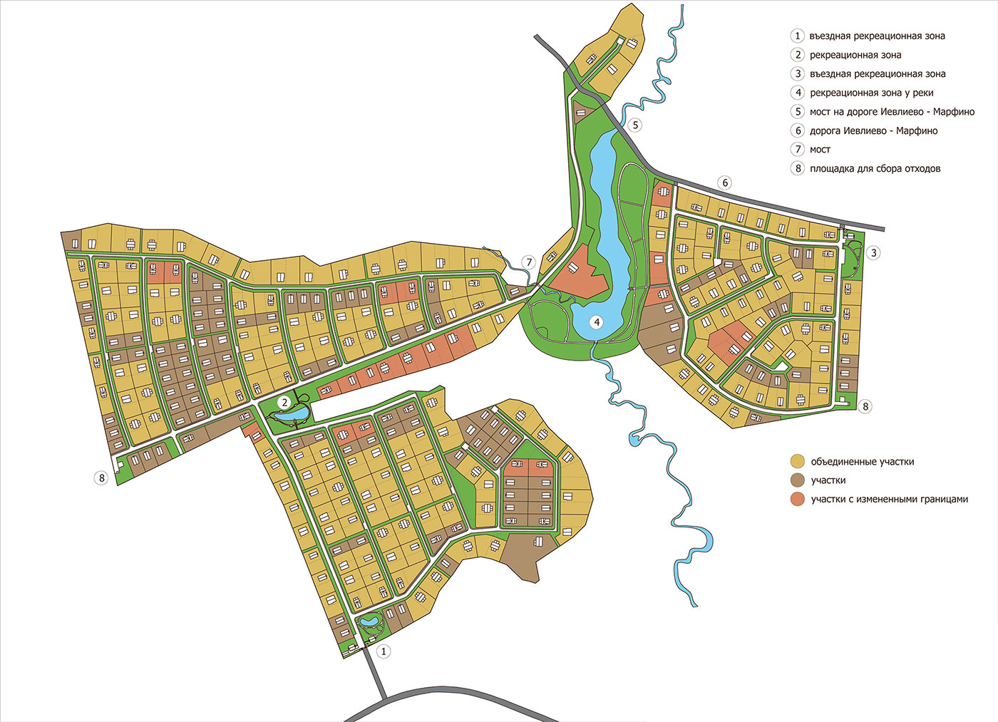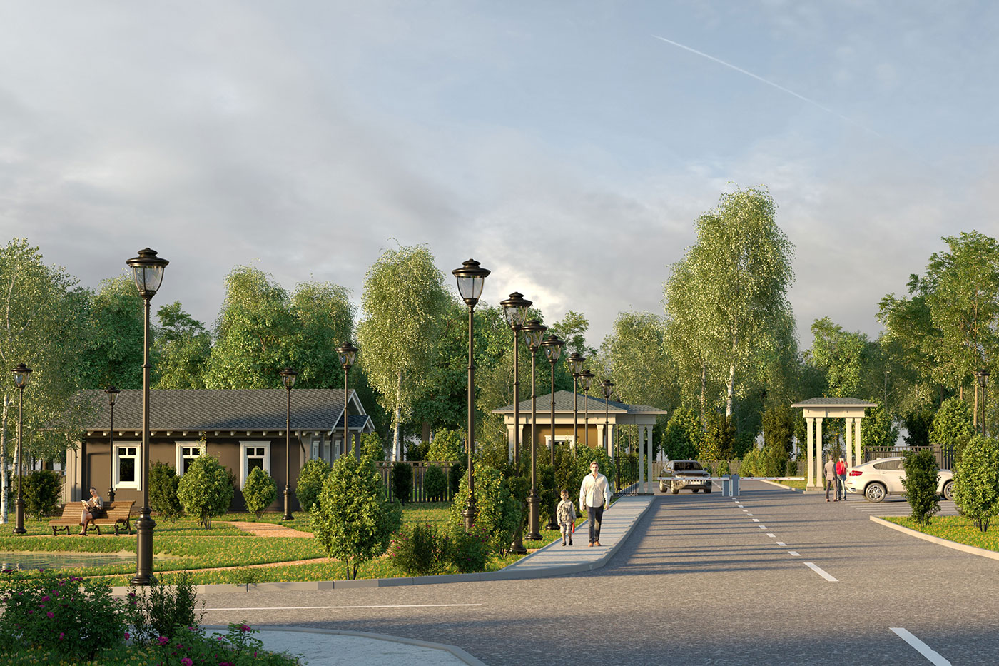 Проектом предусмотрено создание нескольких рекреационных зон. При въезде в поселок парковая зона со зданием администрации и магазином. В центре поселка — зона отдыха с прудом. И ещё одна прогулочная зона около реки.