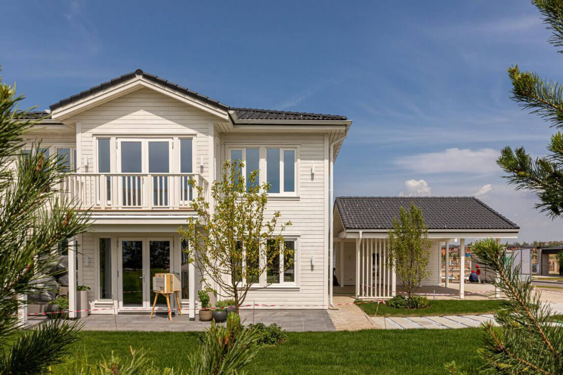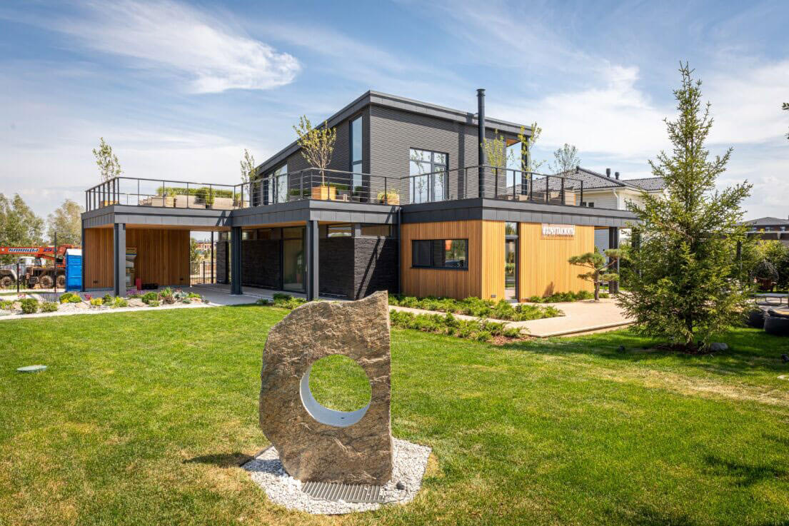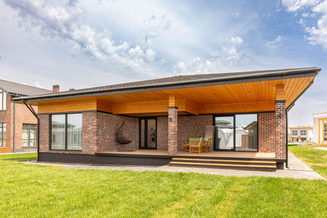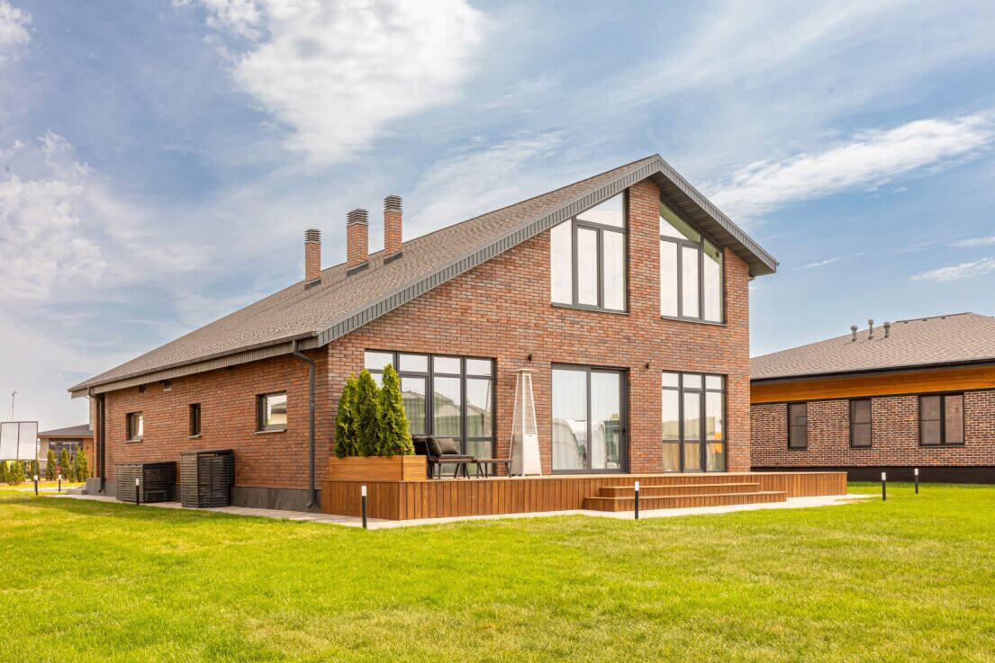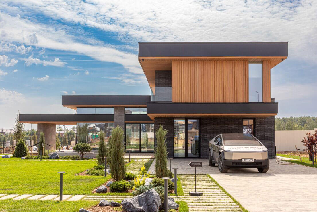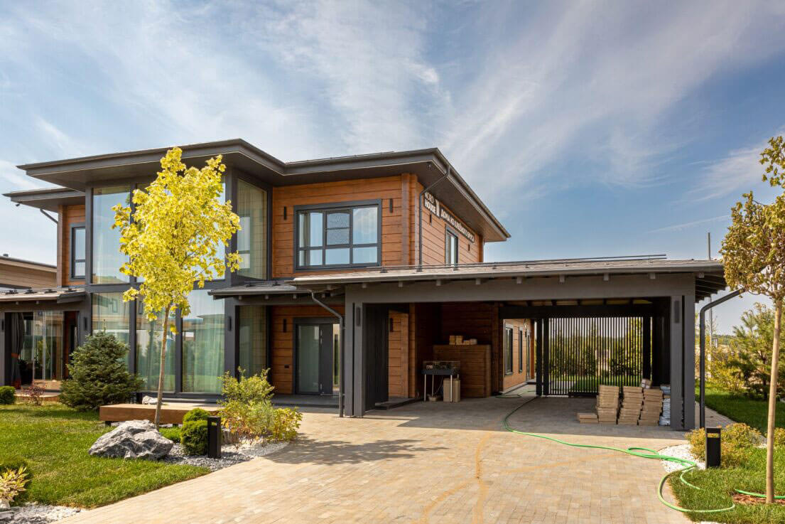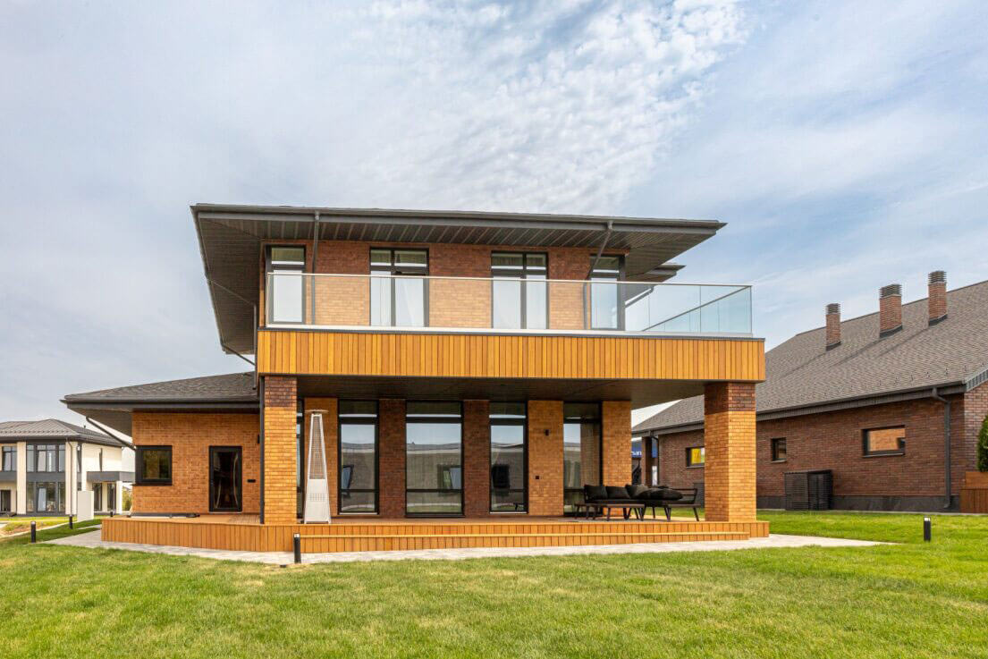 В отделке фасадов применяется выразительная комбинация материалов — кирпич, дерево, панели нейтральных оттенков — что придаёт каждому дому индивидуальность, но при этом сохраняет единую стилистическую ткань поселка. Акцент делается на большие оконные проемы, интеграцию внутреннего пространства с ландшафтом и обширные эксплуатируемые кровли и балконы.