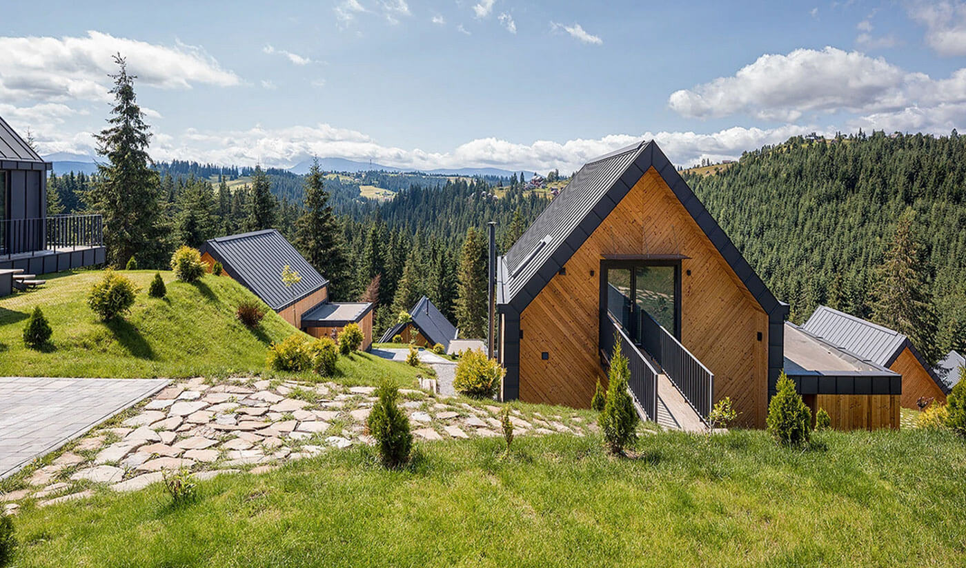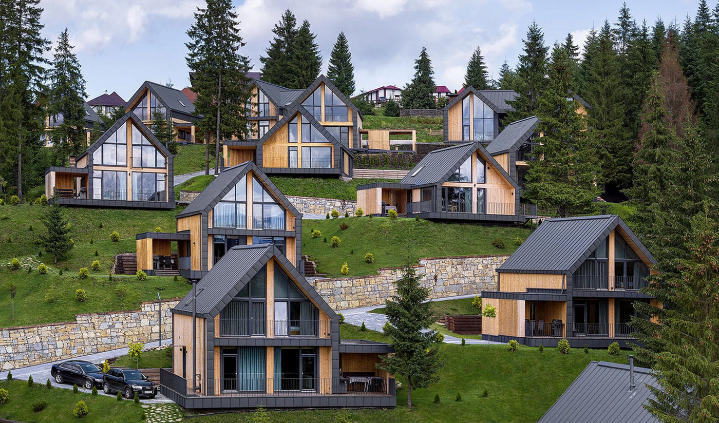 Коттеджный поселок расположен на выразительном природном рельефе, что определяет его уникальную пространственную композицию и архитектурный облик. Архитектурная идея базируется на гармоничной интеграции зданий с холмистым ландшафтом: дома «встраиваются» в склон, повторяя линии естественного рельефа и раскрывая панорамные виды на окружающие леса.