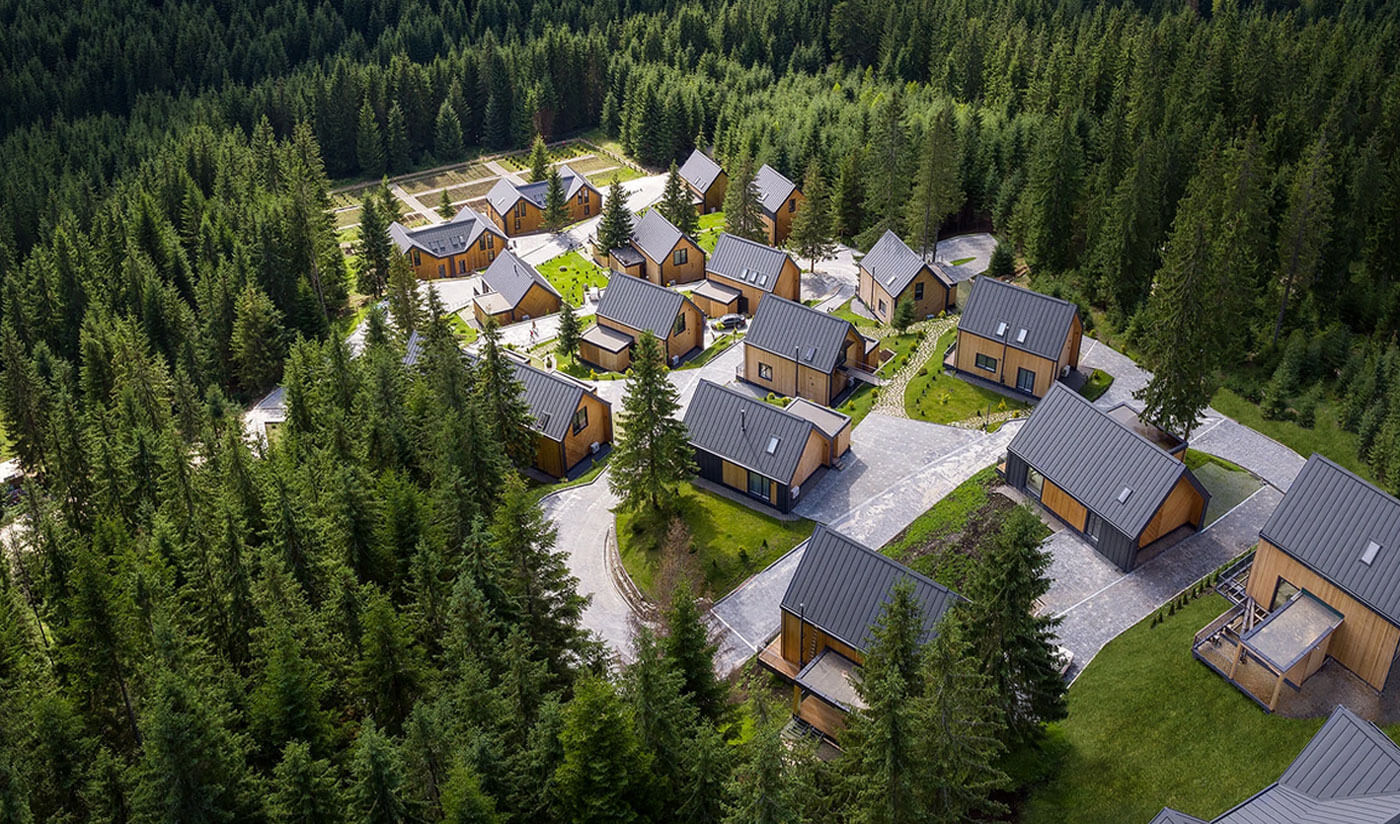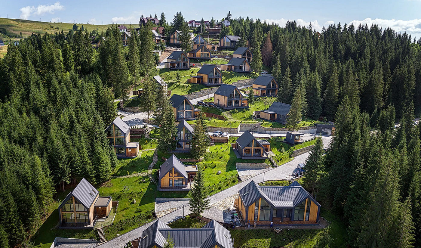 Жилая застройка организована каскадно, что обеспечивает каждой вилле высокий уровень приватности и исключительные видовые характеристики — из крупных окон открываются впечатляющие перспективы на сосновые и еловые массивы. Каменно-деревянные подпорные стены и ландшафтные террасы естественно зонируют территорию, плавно связывая различные уровни улиц, проездов и приватных участков. Дорожки и подъезды органично следуют изгибам рельефа, минимизируя вмешательство в природу.