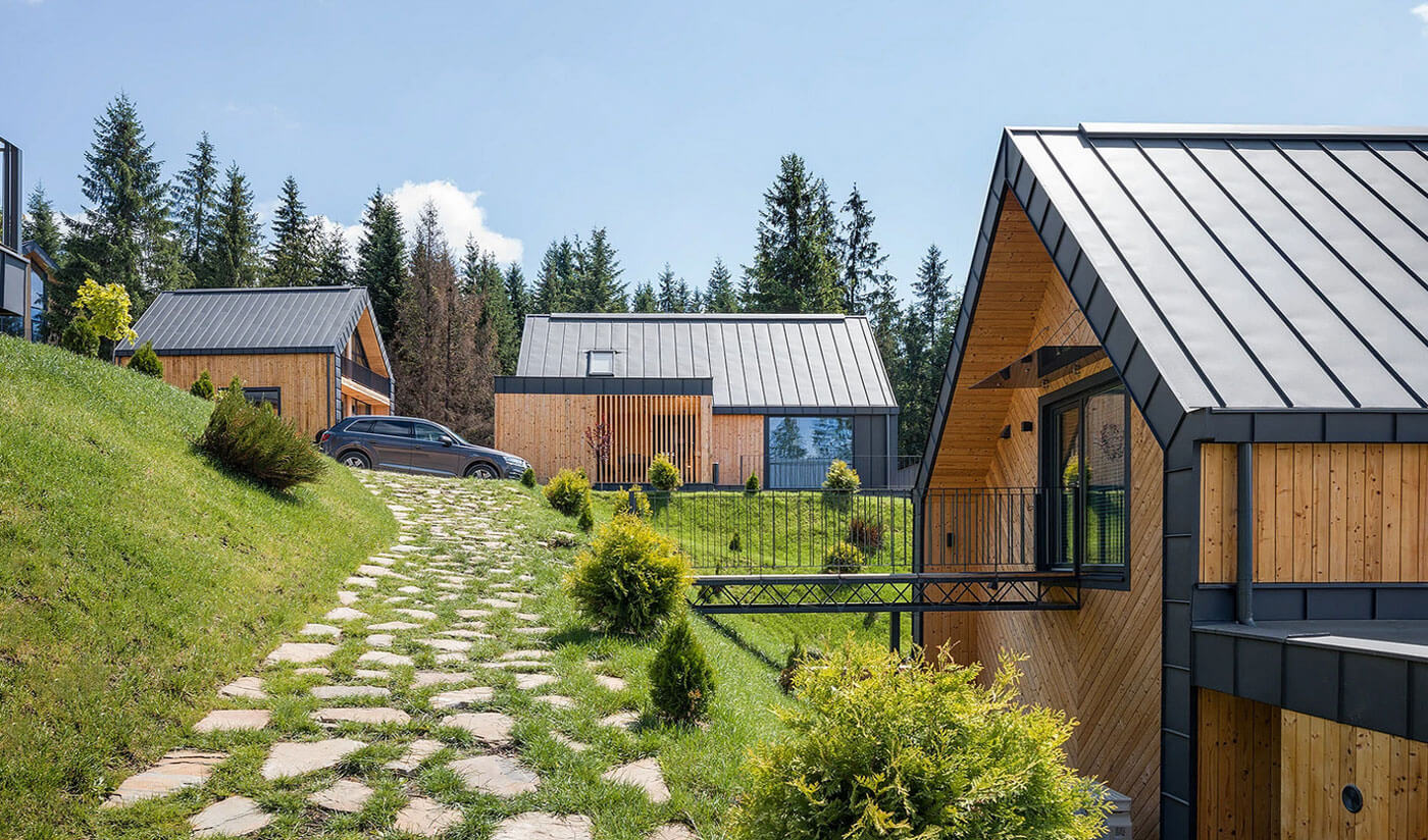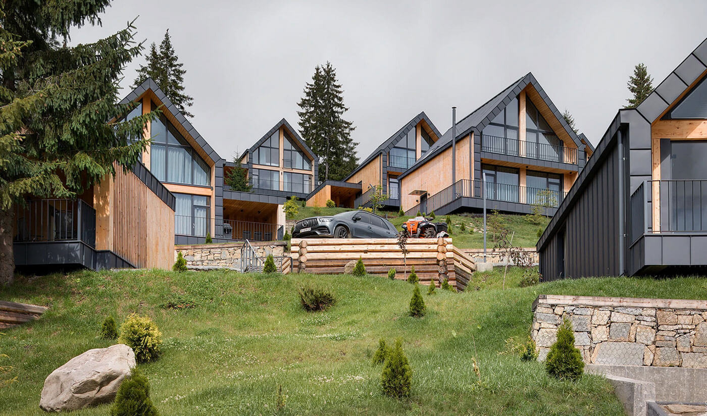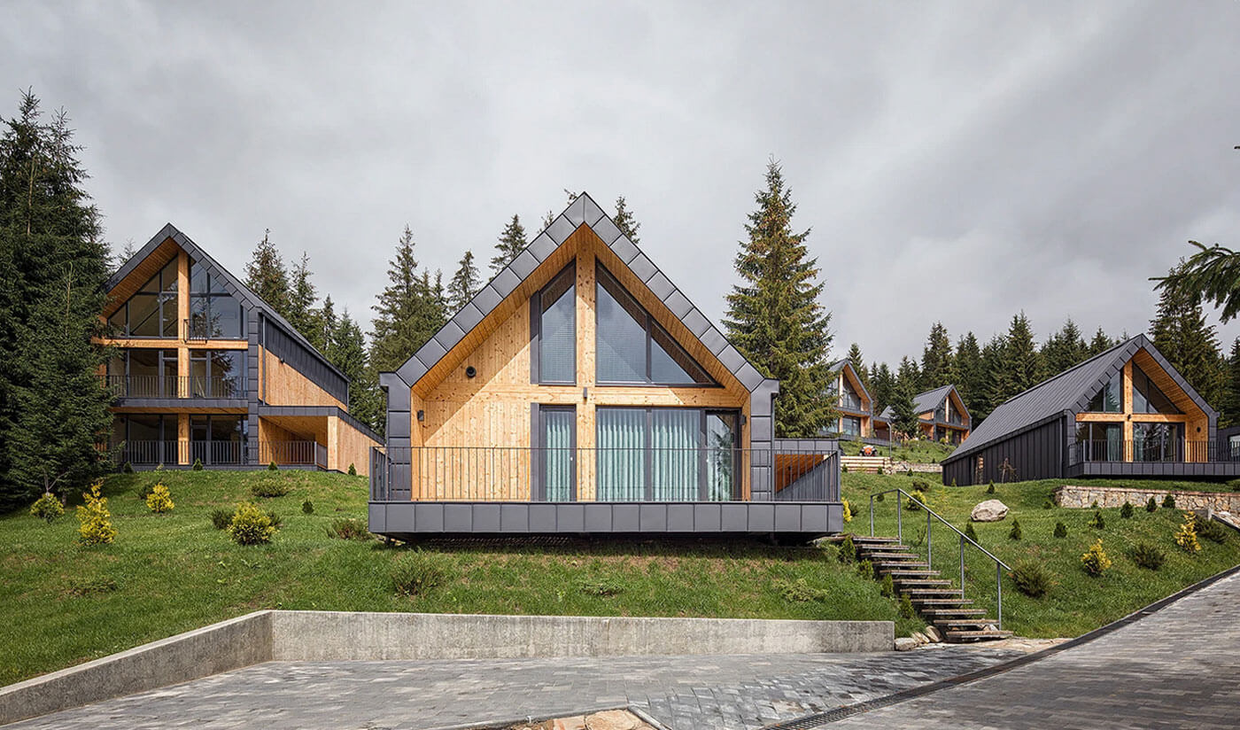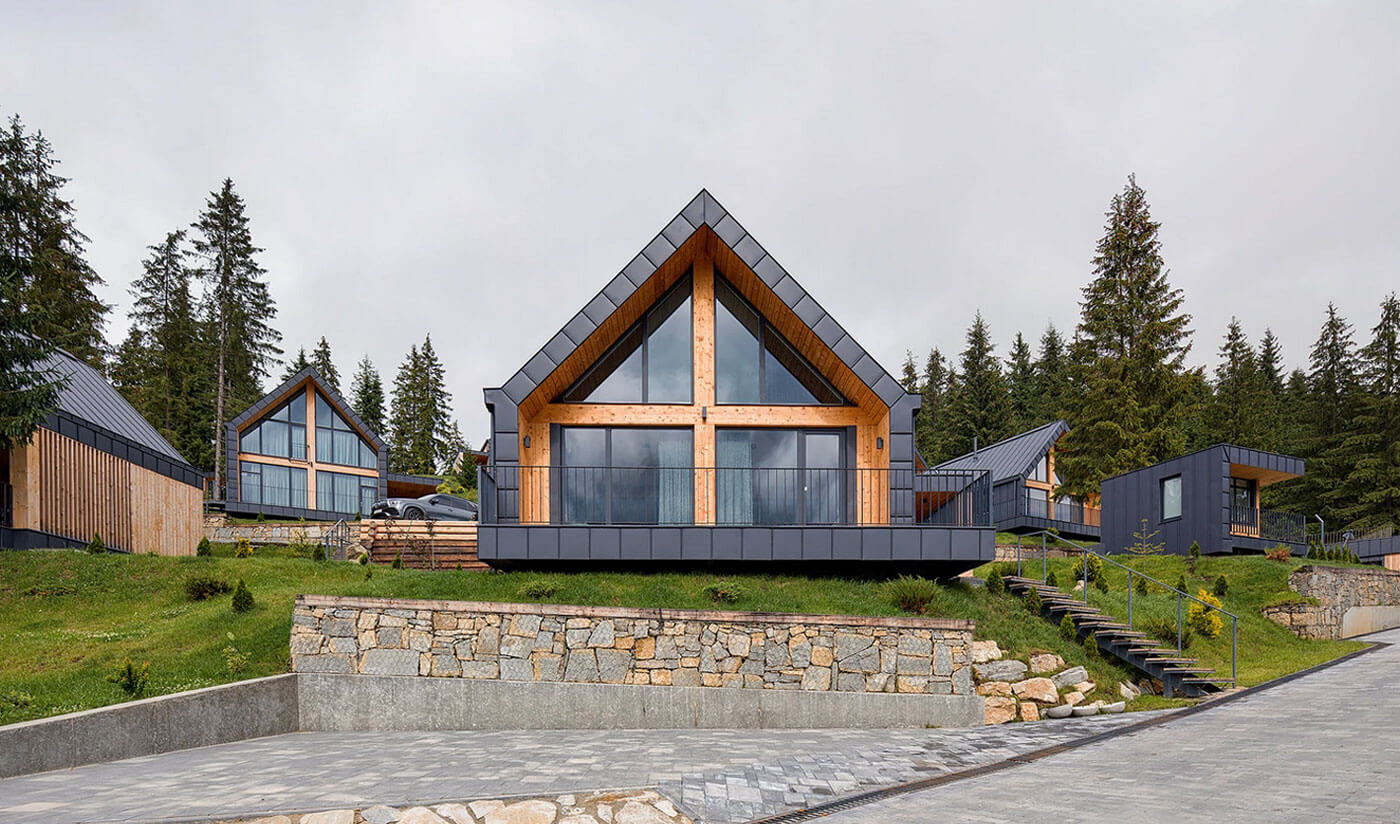 Архитектура домов выдержана в едином современном стиле: преобладают простые, лаконичные формы двухэтажных коттеджей с остроскатными кровлями. Фасады выполнены из натурального дерева и темных металлических элементов, что поддерживает диалог с природным окружением и создает сдержанную, но выразительную визуальную идентичность поселка.