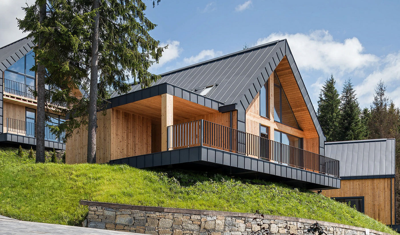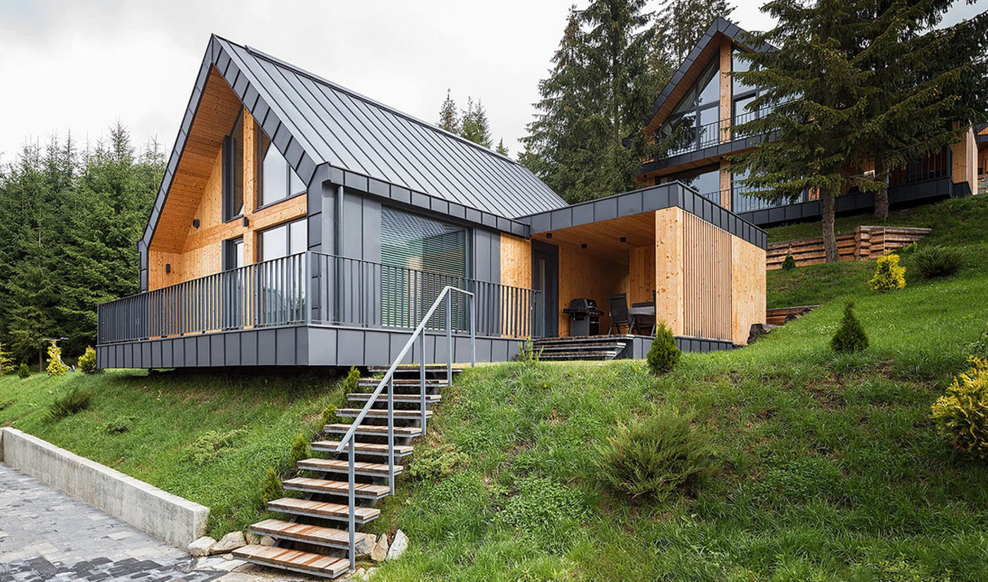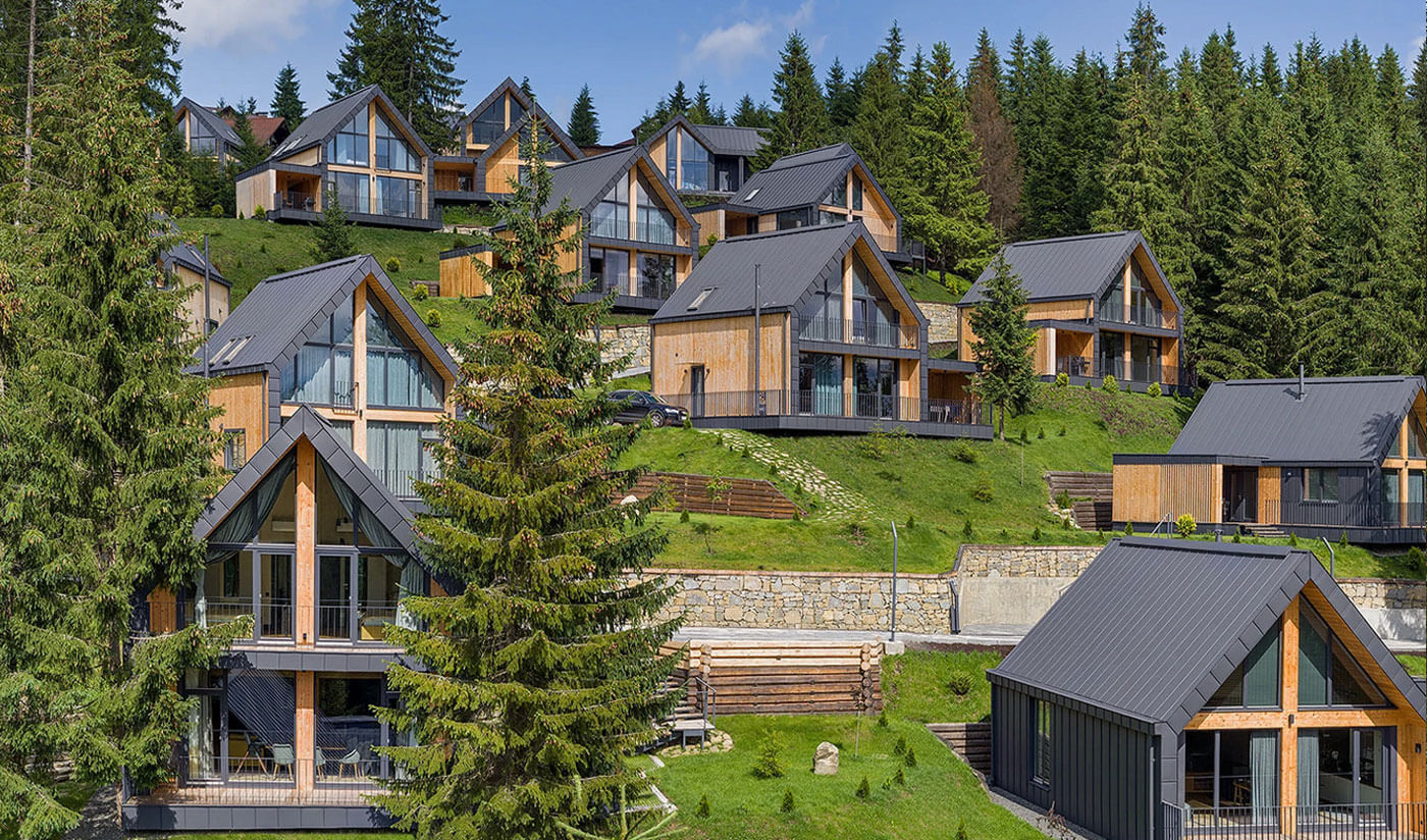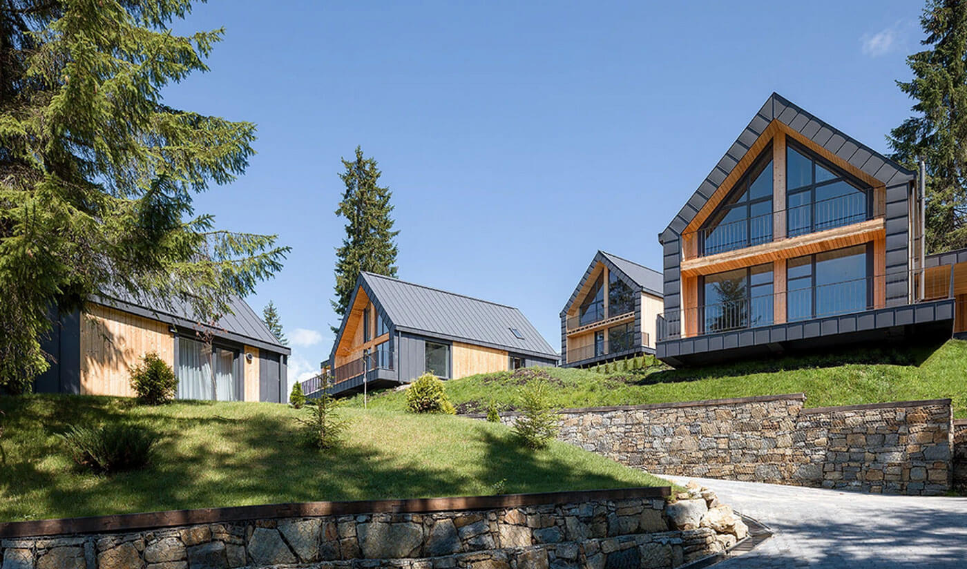 Архитектура домов выдержана в едином современном стиле: преобладают простые, лаконичные формы двухэтажных коттеджей с остроскатными кровлями. Фасады выполнены из натурального дерева и темных металлических элементов, что поддерживает диалог с природным окружением и создает сдержанную, но выразительную визуальную идентичность поселка.