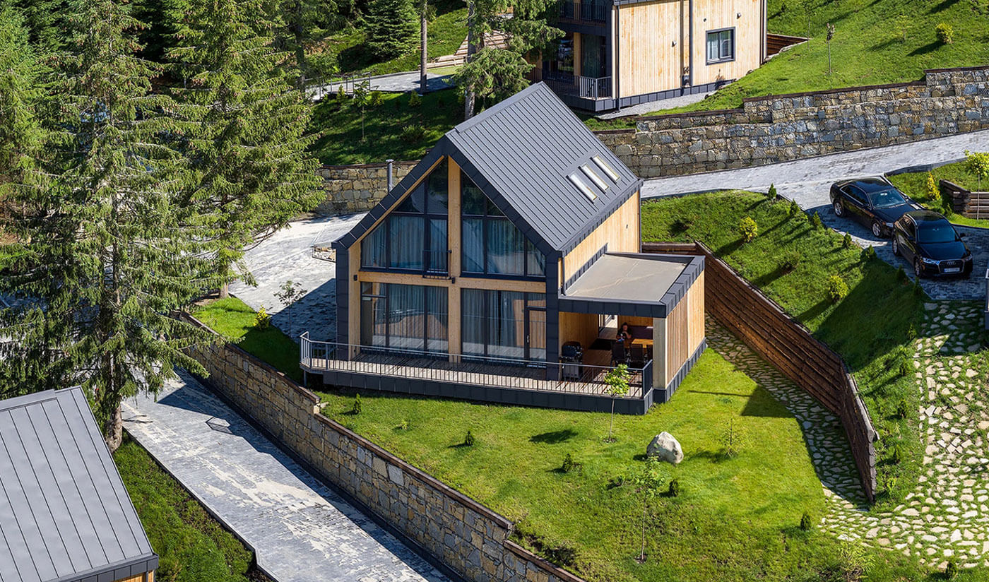Необычная особенность поселка — почти «альпийское» размещение домов на склонах: некоторые виллы возведены на значительных перепадах высот и соединены лестничными и мостовыми переходами. Это архитектурное решение не только усиливает уникальность силуэтов на фоне рельефа, но и позволяет создавать разнообразные приватные террасы и видовые площадки для каждого жителя. Таким образом, архитектура поселка становится продолжением ландшафта, предлагая новый опыт жизни вне города — в диалоге с природой, пространством и светом.