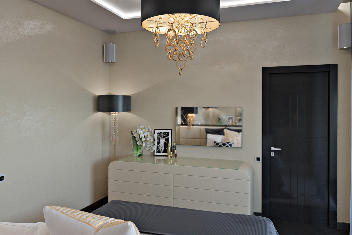 В спальню внесли немного солнца в виде нежных бежевых оттенков стен, кровати, бликов золота. <a href=