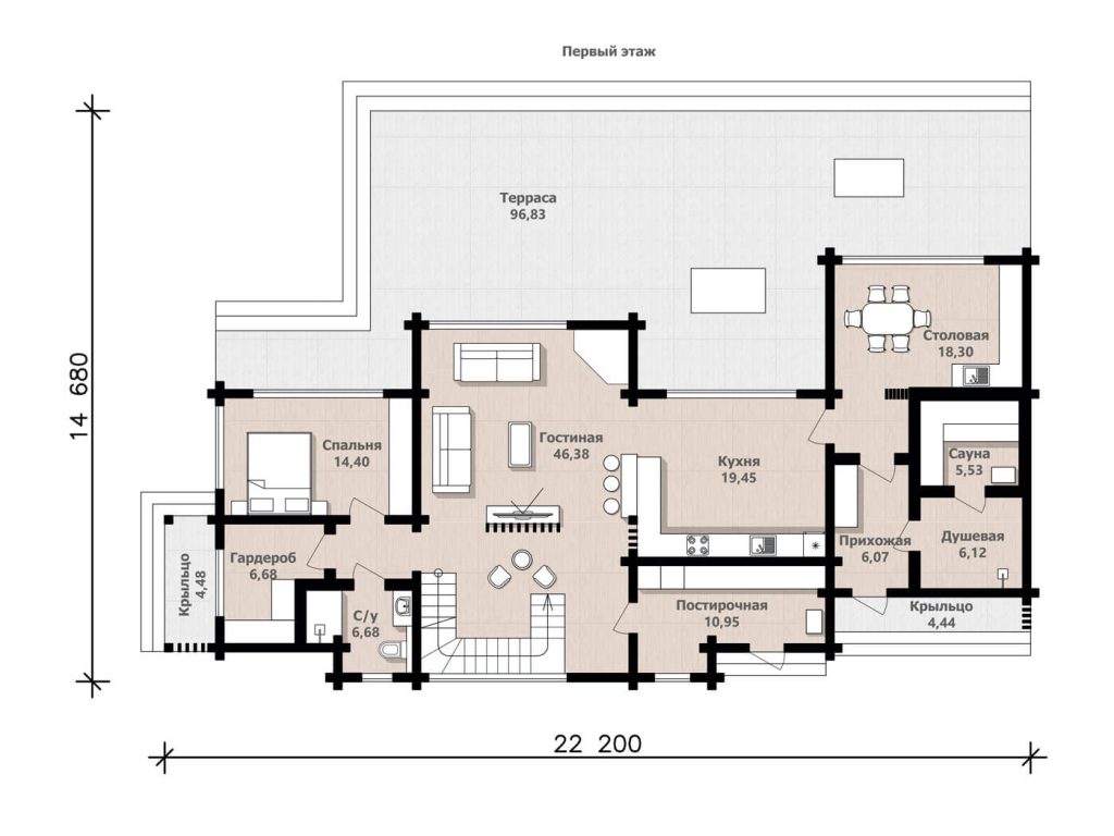 На первом этаже вас встречает просторная гостиная, плавно переходящая в кухню, – сердце дома, где рождаются теплые воспоминания.