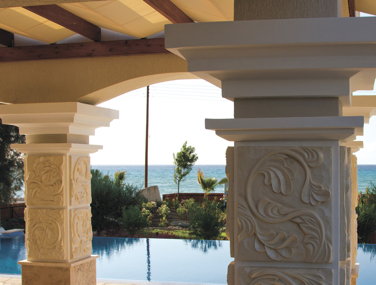 Решение колонны и материалы понятны: цоколь - выразительный травертин из Греции, барельефы с растительным орнаментом под заказ по эскизам.