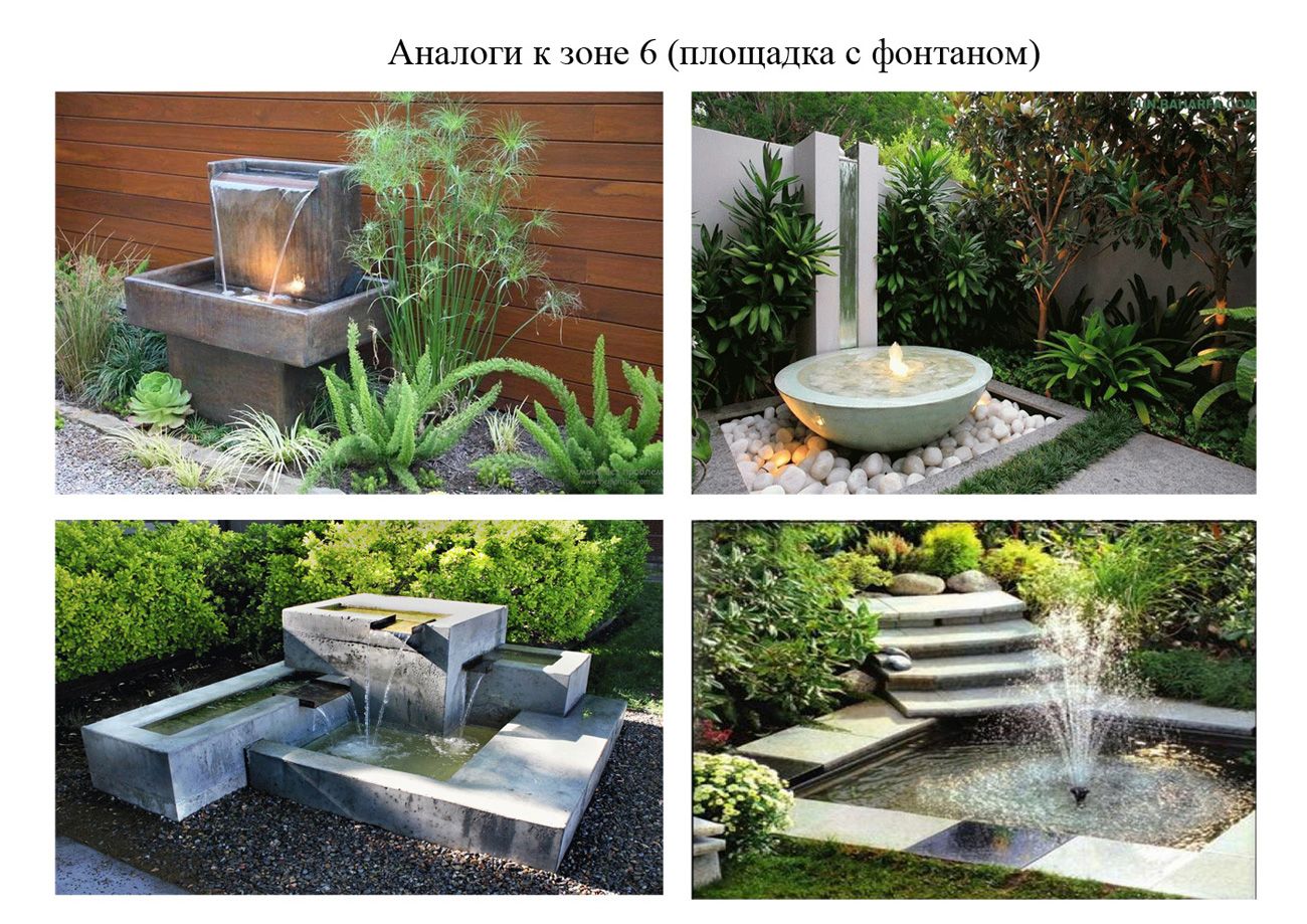 Первый — пристенный фонтан, выполненный из лиственницы в сочетании со сталью кортен и зеркальными вставками, дополненный подвесными цветочными ящиками (также сталь кортен). Геометрический узор этой композиции повторяется в формах приподнятых клумб, расположенных через дорожку от фонтана.