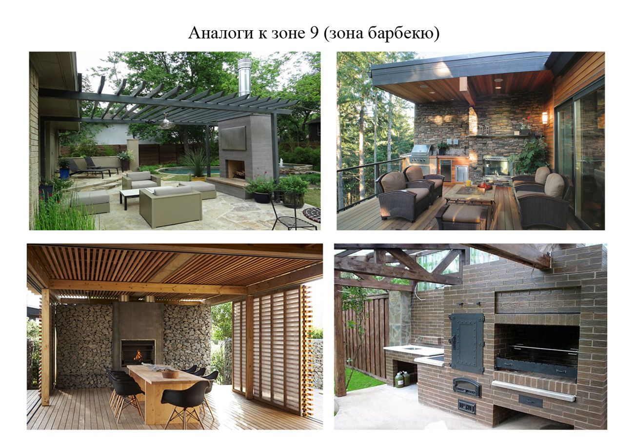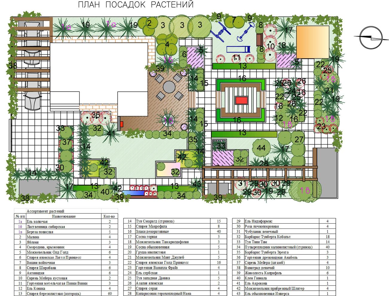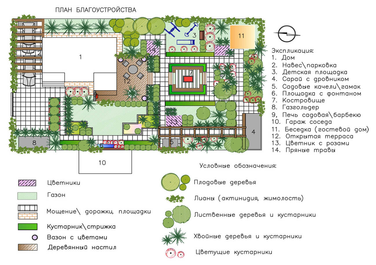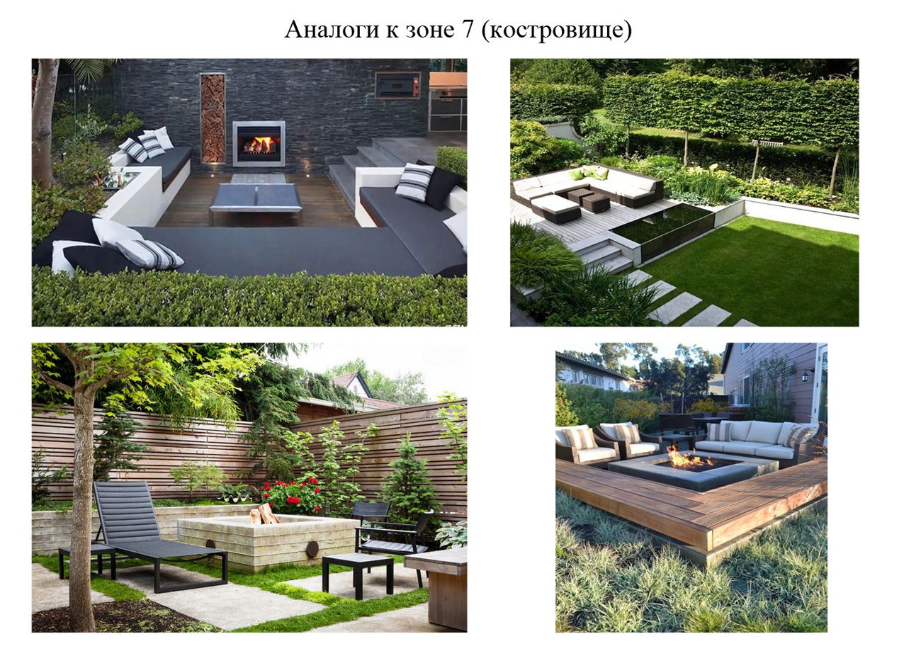 За зоной костра, под березой, наметили сделать искусственный рельеф методом фитопластики, слева от нее в небольшом фруктово-ягодном садике — детскую площадку, а справа — розарий и галерею с лавочкой (компания ROYAL BOTANIA).