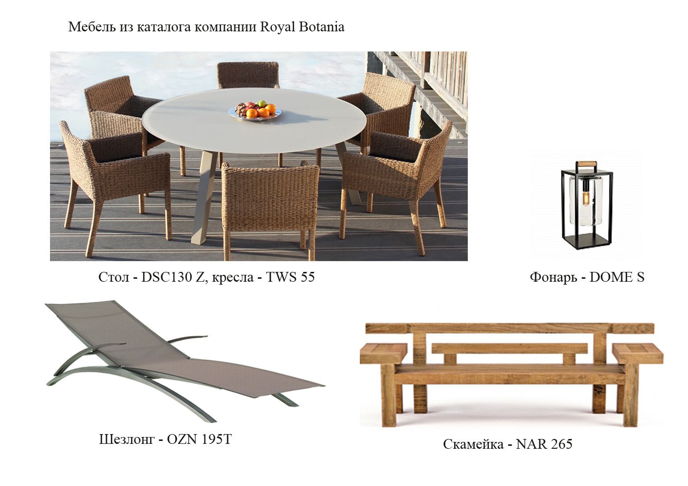 Вблизи дома — две взрослые лиственницы, они отлично вписались в контур открытой веранды. В их тени расположились и обеденная группа, и шезлонги (ROYAL BOTANIA).