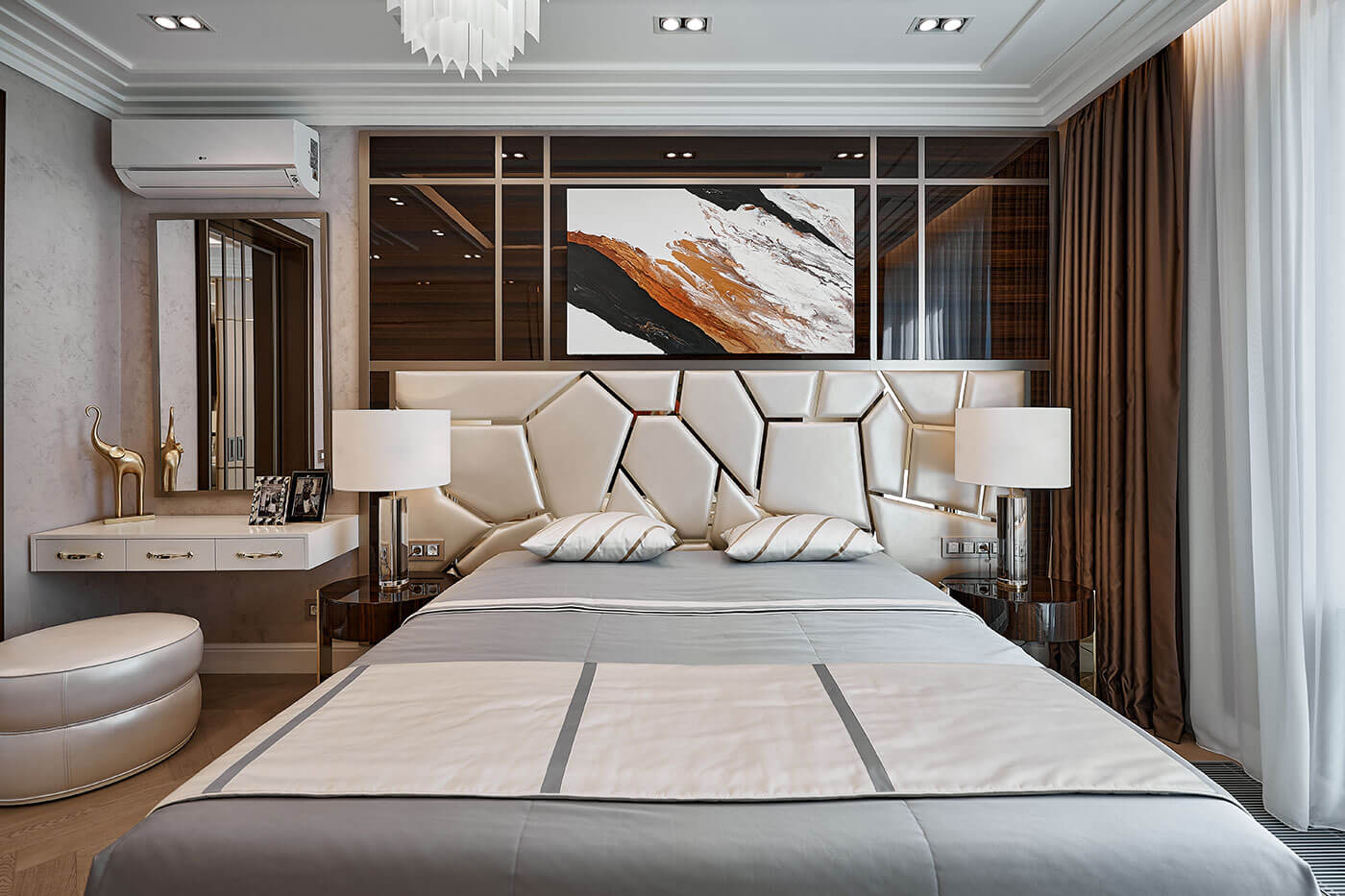 В гостевой и мастер-спальнях организованы полноценные гардеробные комнаты. А в одной из них еще и замаскировали шкаф за дверью скрытого монтажа. В изголовьях кроватей установили декоративные панели из шпона и в тканевой обивке.