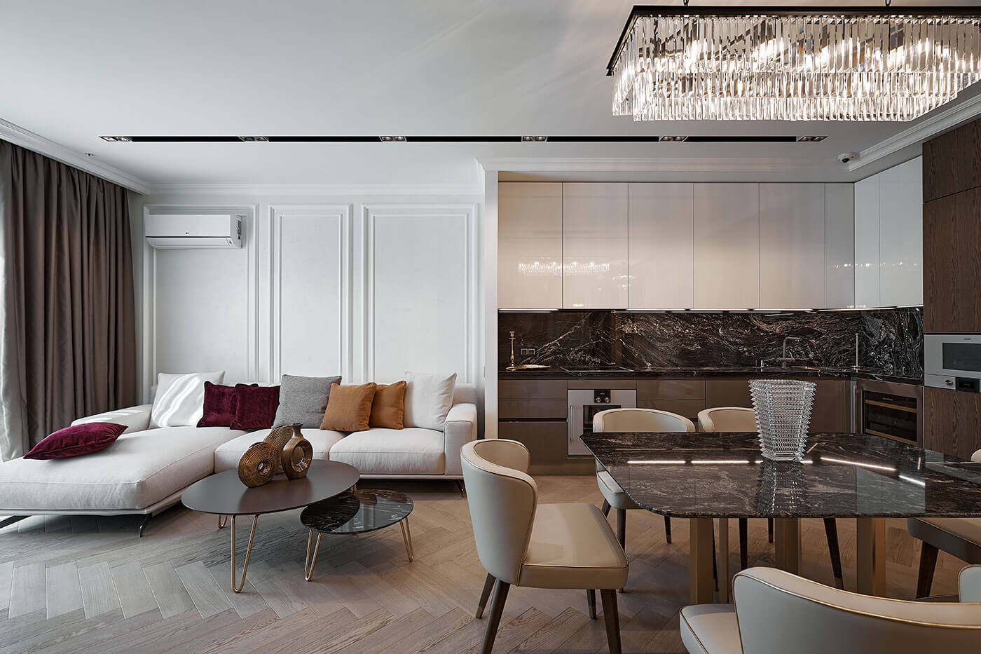 Бежевый, белый, коричневый и серый — именно такую цветовую гамму выбрала молодая семья для своей квартиры. В студию они обратились уже имея четкое представление, каким должен быть стиль — классика в спокойных тонах.