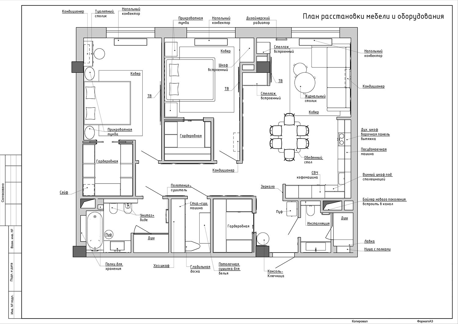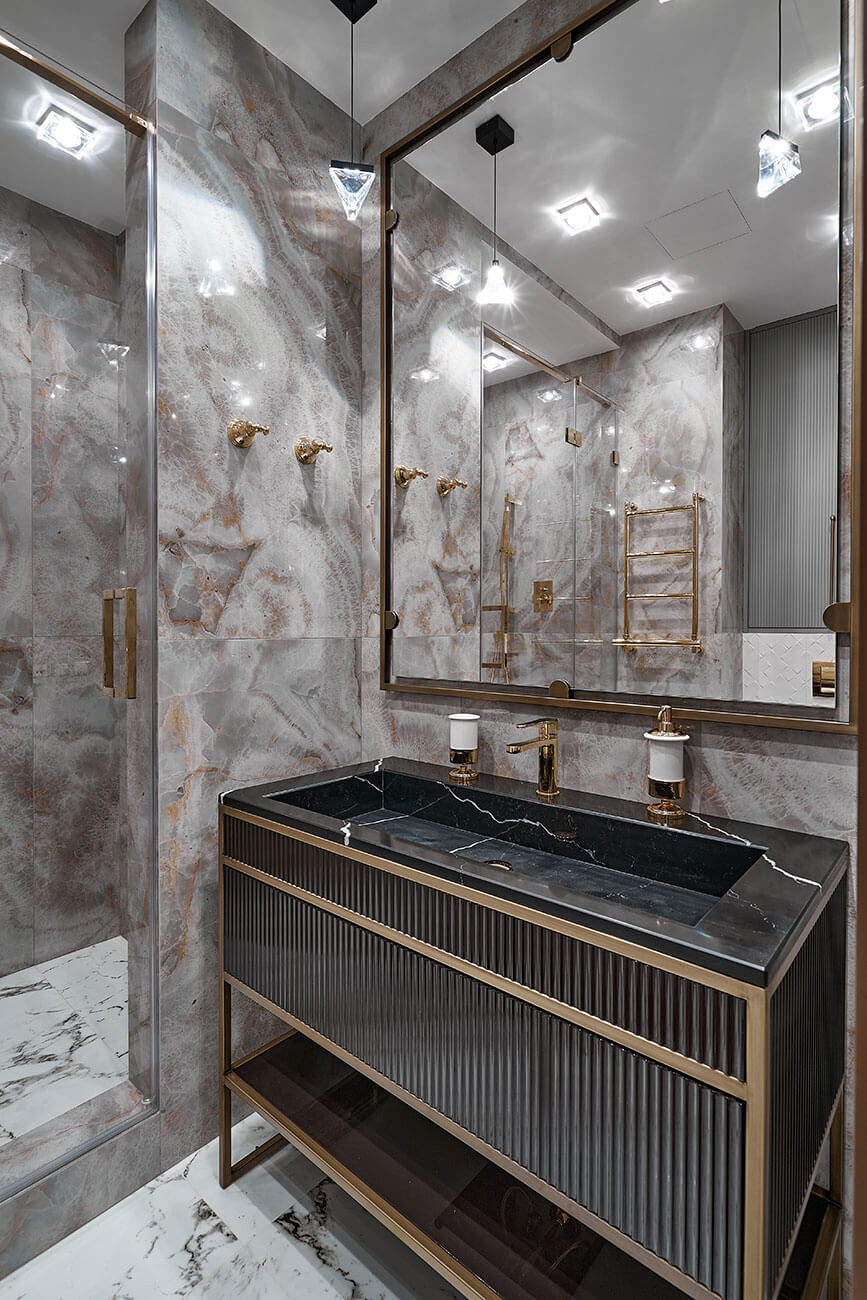 Каждый уголок этой квартиры мы постарались сделать не только красивым, стильным и изящным, но и максимально функциональным. Там, где можно было поставить встроенный стеллаж или шкаф для одежды — они появились. В санузле, где изначально планировалась только душевая кабина, получилась еще и ванна. А сзади гардеробной «у входа» мы выделили место под небольшую прачечную комнату с машинкой, полотенцесушителем и гладильной доской.