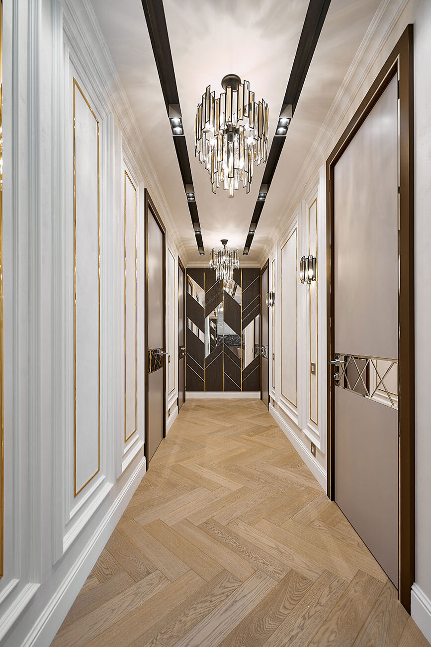 Проектируя коридор с подвесными люстрами и магнитными треками под потолком, в финале мы поставили стеновую панель, облицованную шпоном с зеркальными вставками.