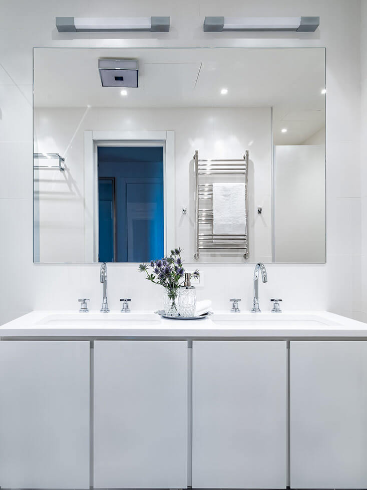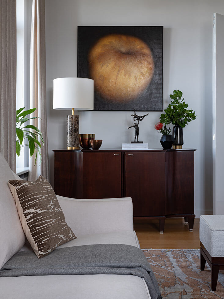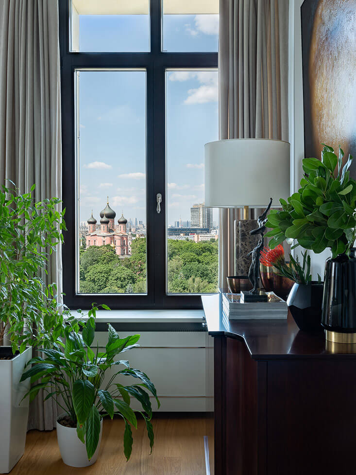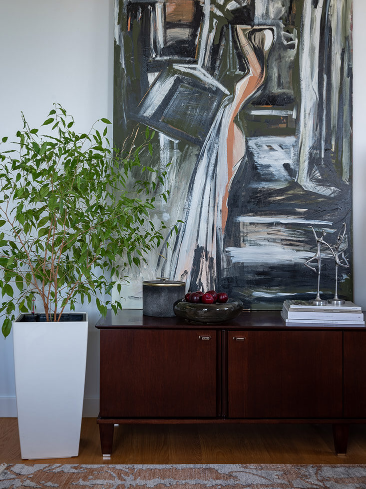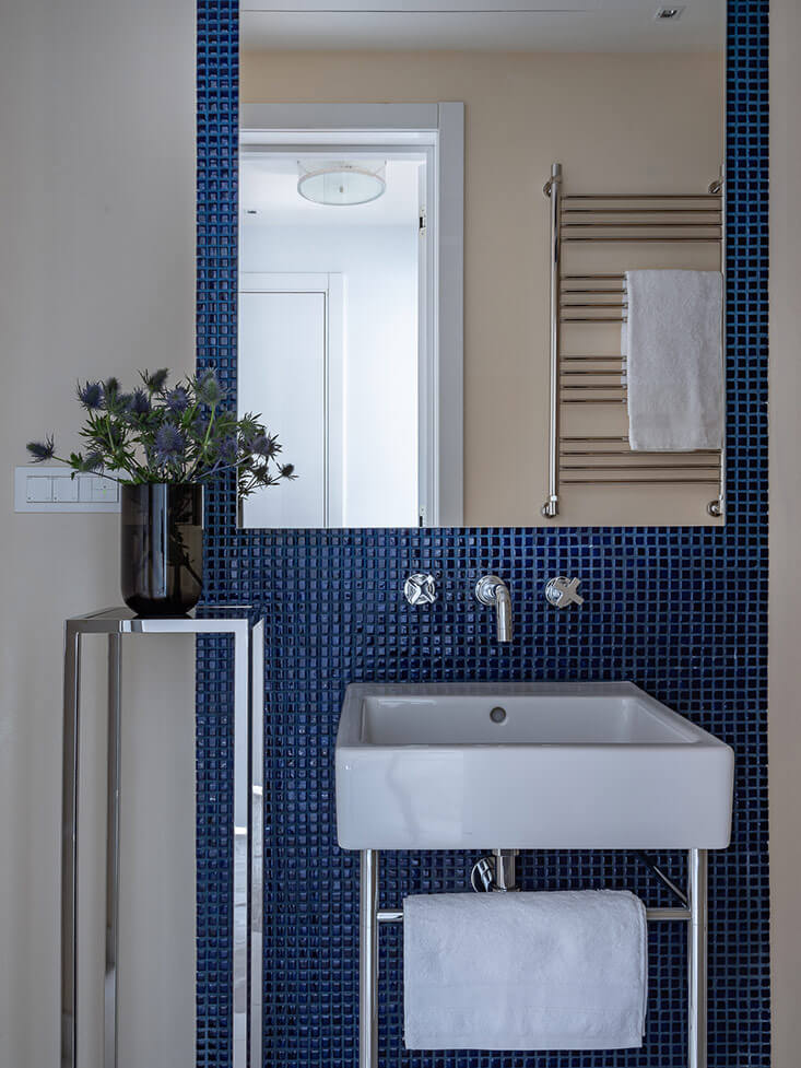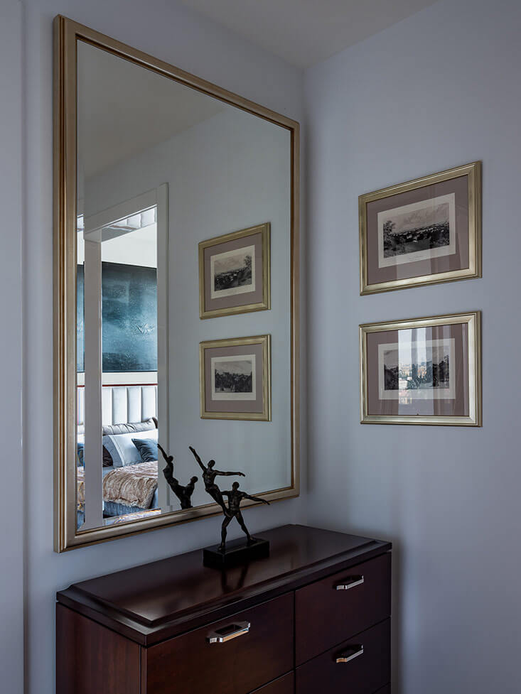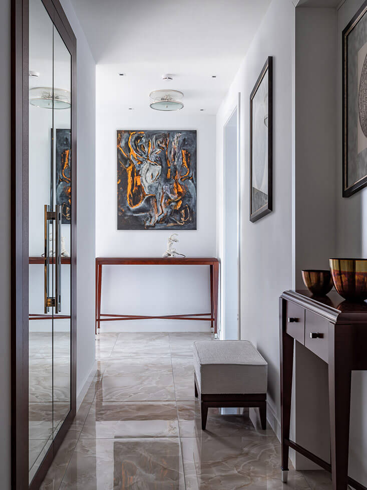Почти все стены в квартире несущие, поэтому сделать перепланировку было невозможно. Единственная зона, которую удалось переоборудовать — второй санузел с постирочной. В оформлении интерьера квартиры дизайнеры использовали атрибуты классического стиля: симметричные композиции, строгие формы мебели, натуральные материалы. Шика и изящества облику придают глянцевые металлические детали и, конечно, масштабные картины, которые цепляют взгляд.