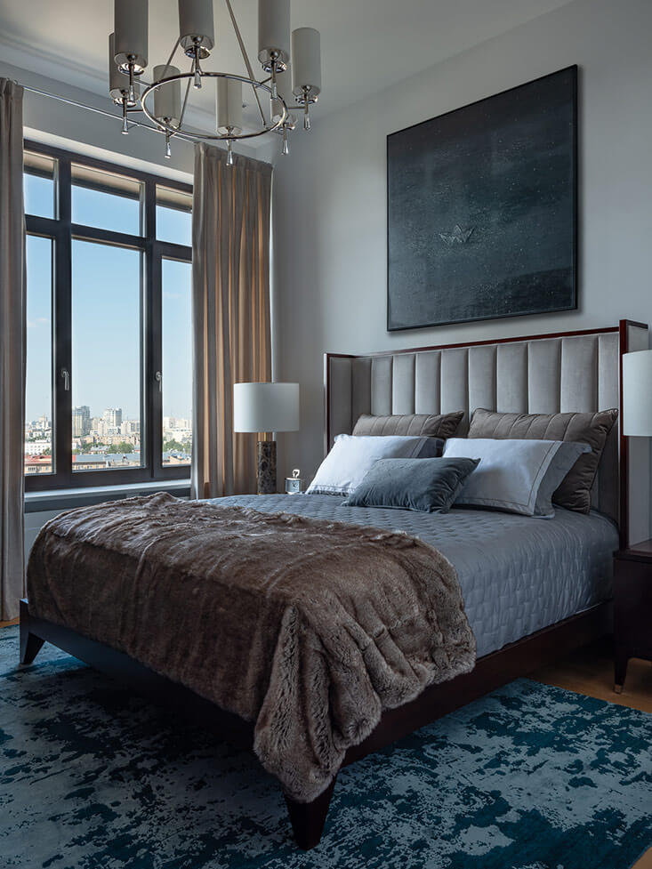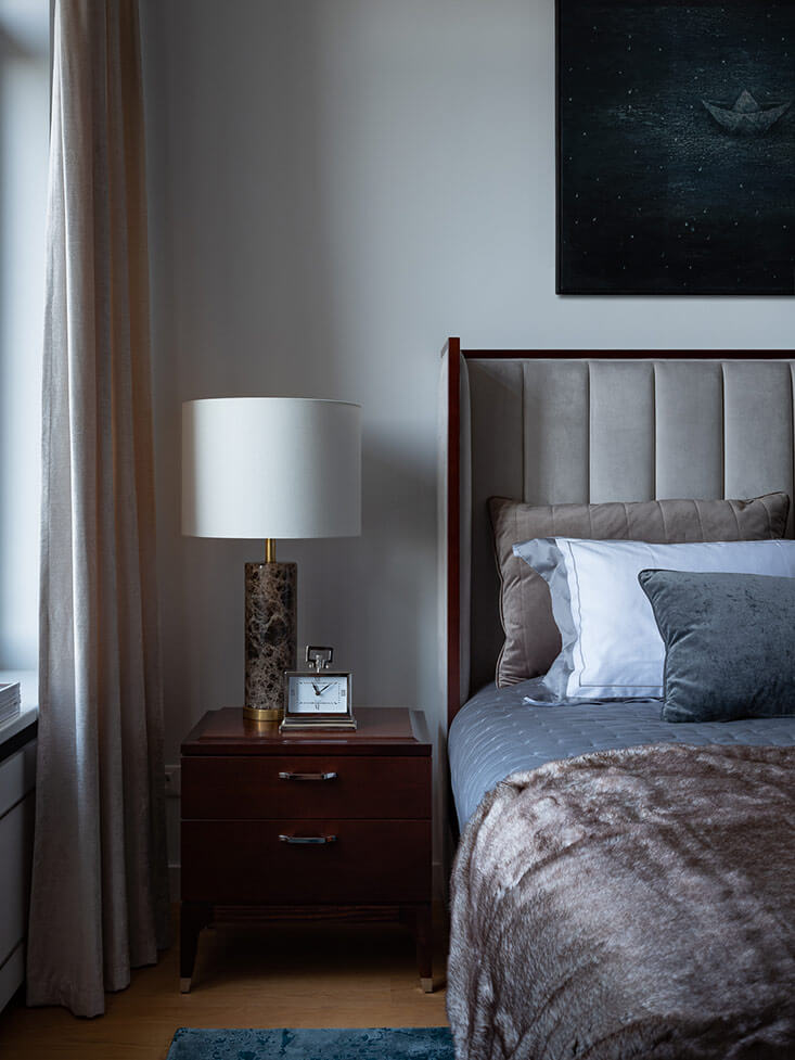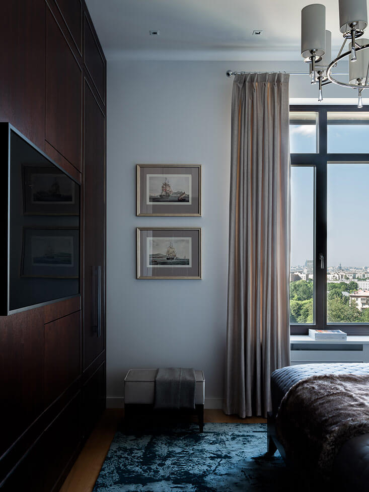 В спальне была техническая ниша. В нее дизайнеры вмонтировали шкаф, а остальную часть стены закрыли панелями, шпонированными американским орехом. Так получилось создать удобный скрытый гардероб с декором из никелированной стали. Темная, но совсем не мрачная картина над изголовьем кровати перекликается с ковром насыщенного сине-зеленого цвета, а шоколадные и бежевые оттенки и бархатистые текстуры создают атмосферу уюта.