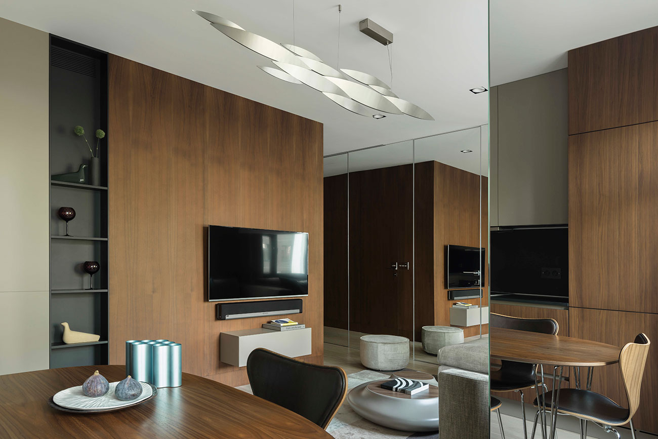 Декоративное решение интерьера еще больше усиливает ощущение, что квартира куда больше и просторнее, чем есть на самом деле. Зоны перетекают друг в друга, а помещения словно стремятся вырваться из очерченных границ. Этот эффект достигается за счет использования зеркал и фактуры американского ореха, которые переходят из прихожей в гостиную, а оттуда на кухню, и отчего гостевое пространство