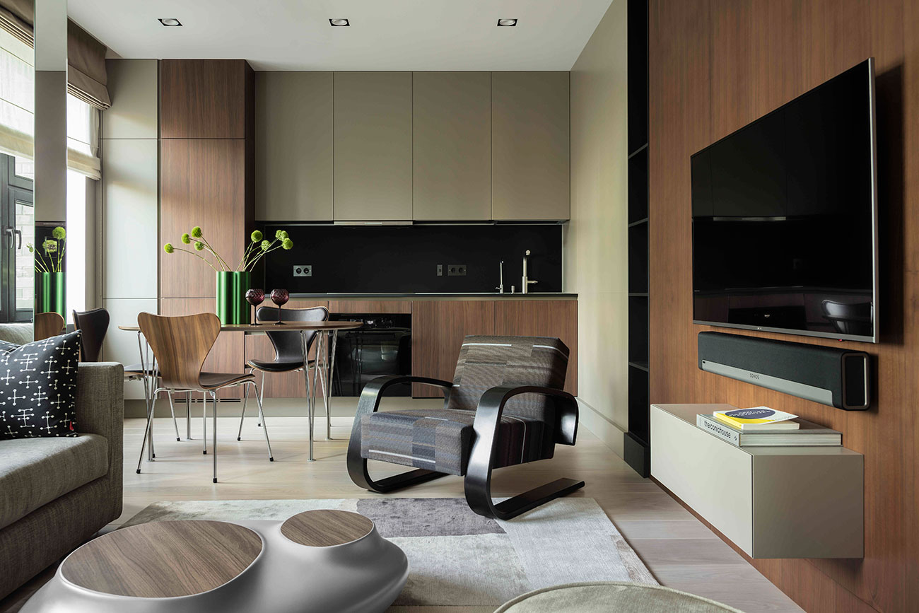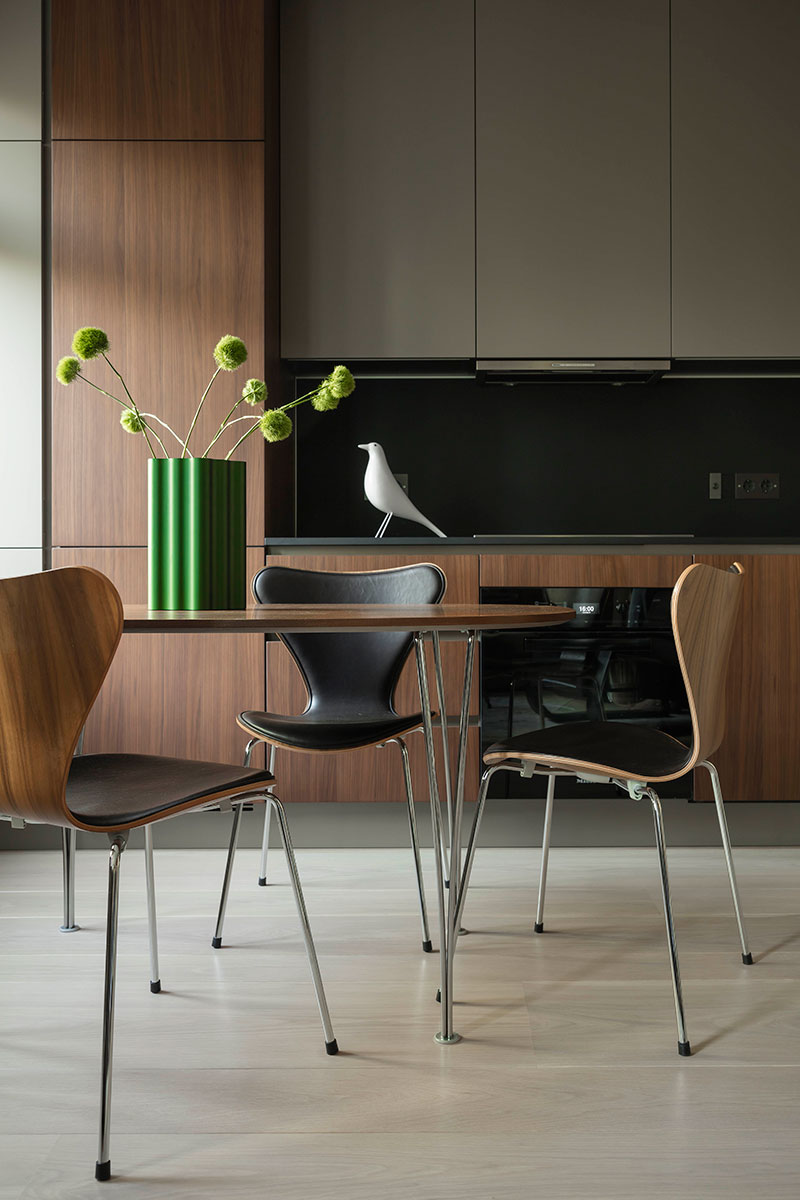 Респектабельную атмосферу усиливает дизайнерская мебель, в том числе культовые дизайнерские предметы, которые всегда в тренде.
