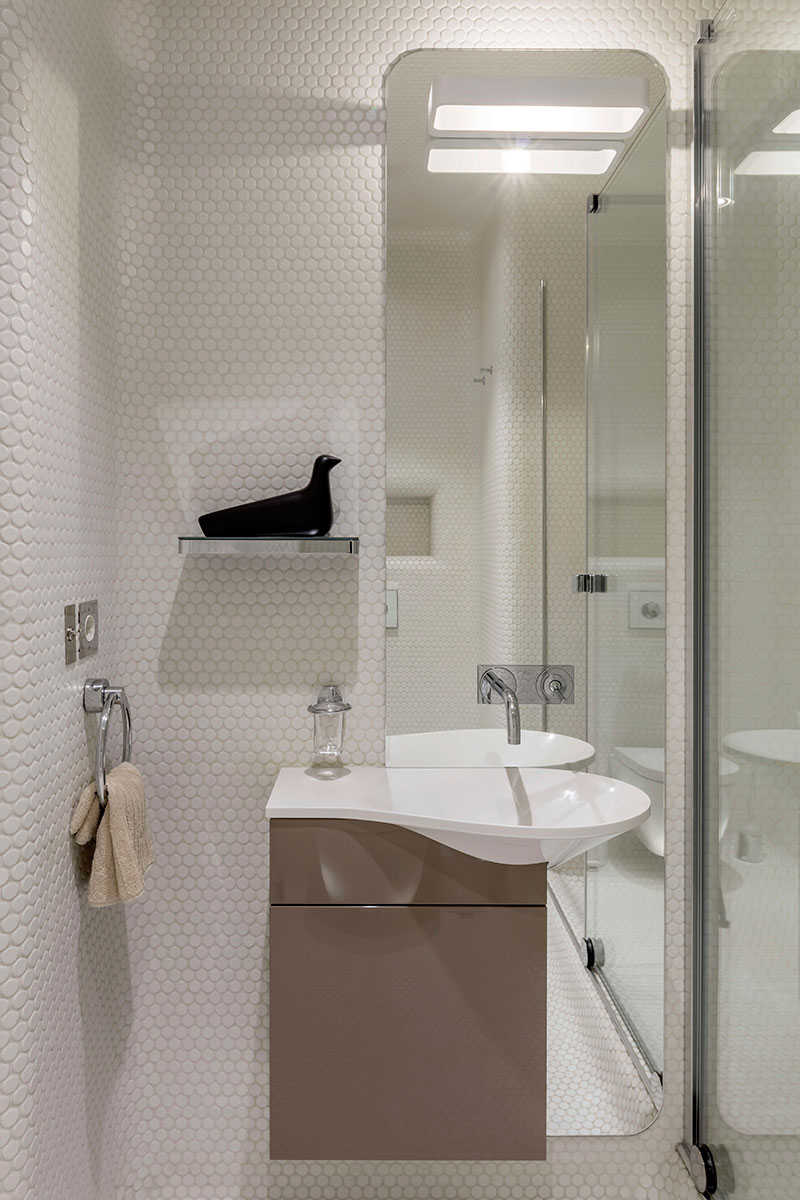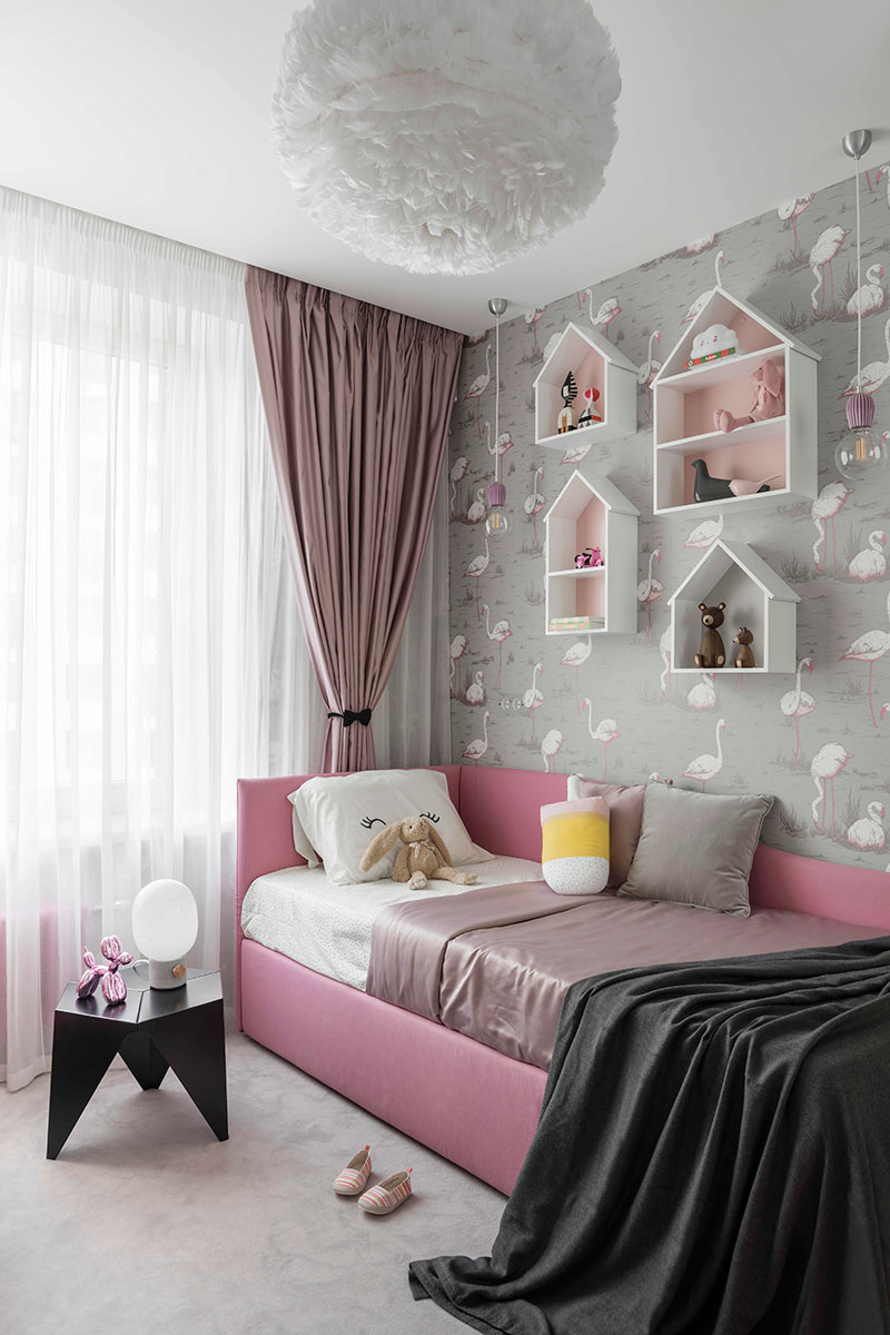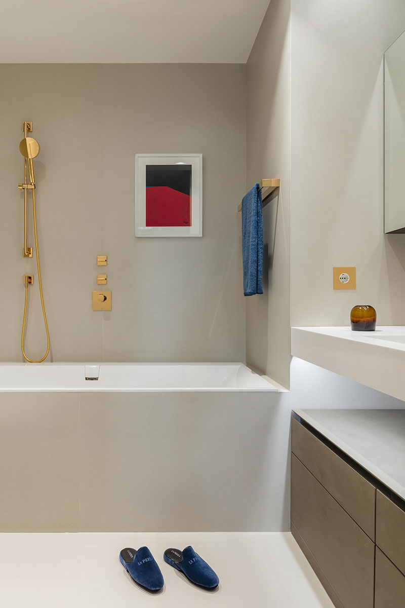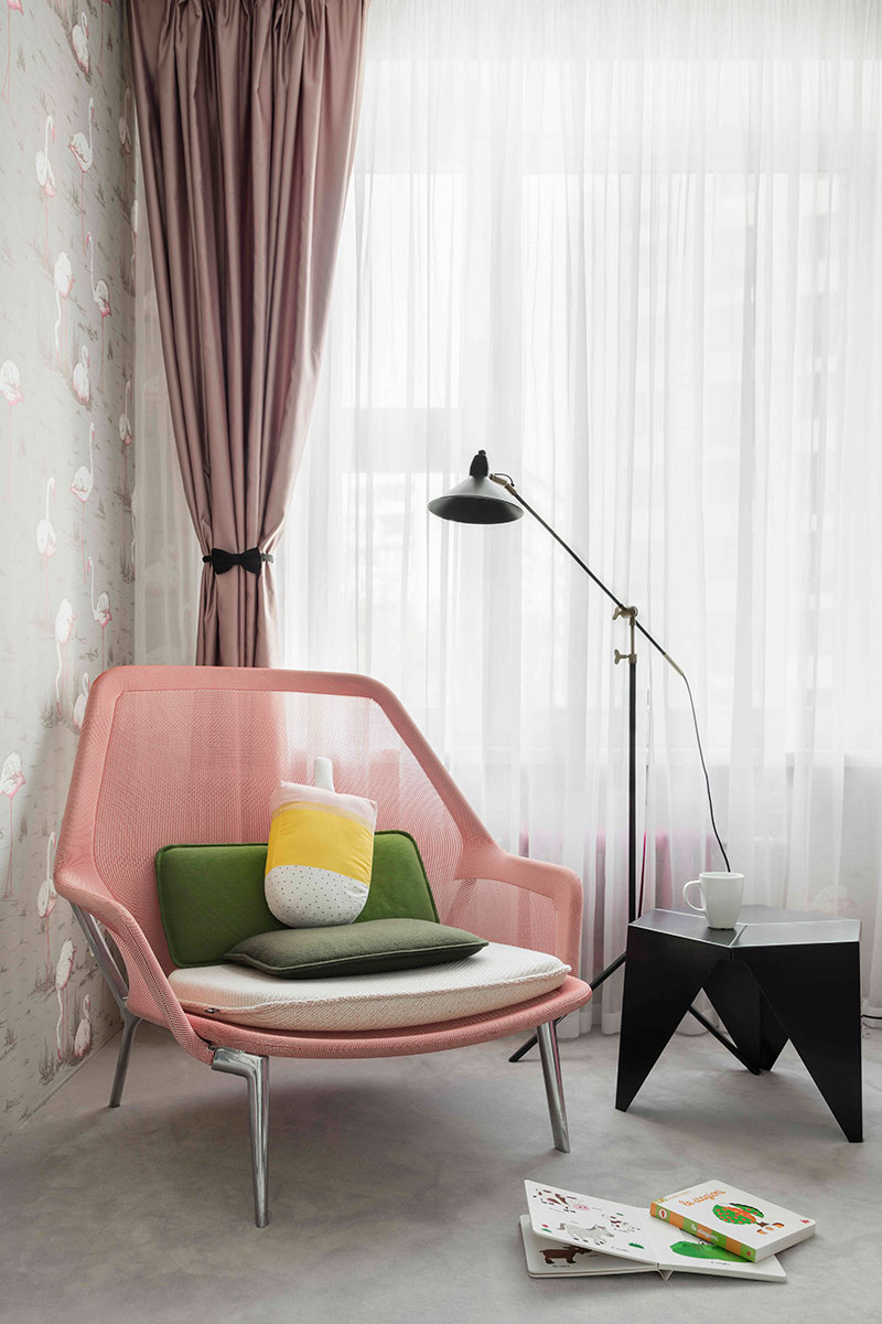 На площади 70 кв. м расположены общая гостиная-кухня, спальня со своей ванной комнатой, детская двоих дочерей, гостевой санузел, гардеробная, постирочная и компактная прихожая. Эргономика пространства рассчитана до сантиметра, каждая деталь на своем месте.