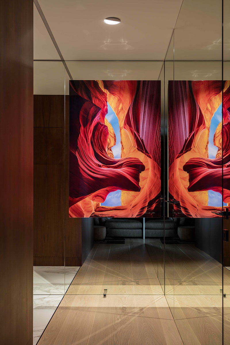 В поддержку к стеновым панелям из американского ореха архитектор использует напольную доску разной ширины (от 15 до 40 см) из массива выбеленного дуба с благородной сединой. Почти все помещения (кроме детской) исполнены в единой цветовой палитре с землистыми, оливковыми и коричневыми оттенками.