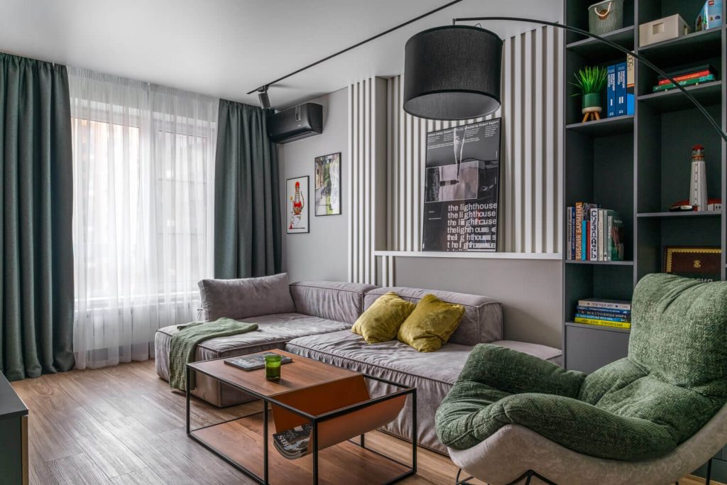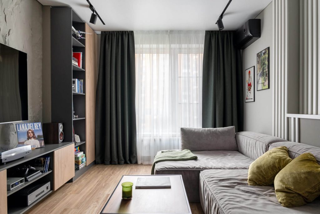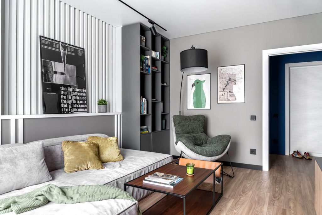 Необходимо было сделать комфортную гостиную с уютным уголком для чтения, разместить книги о дизайне и путешествиях, виниловый проигрыватель с музыкальной системой.
