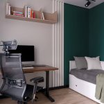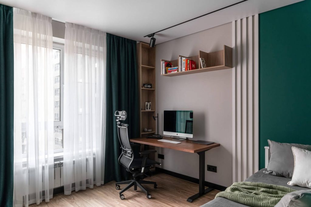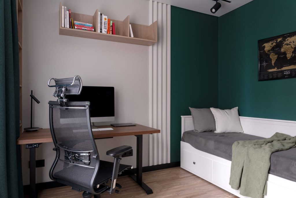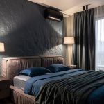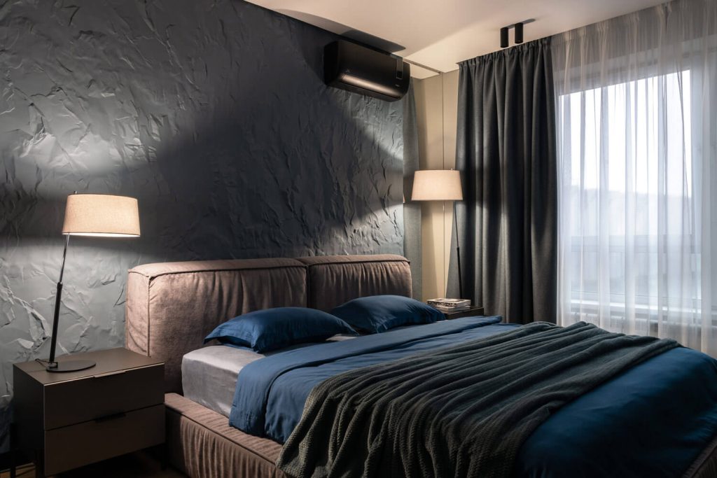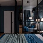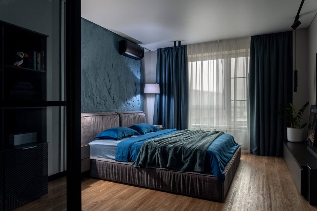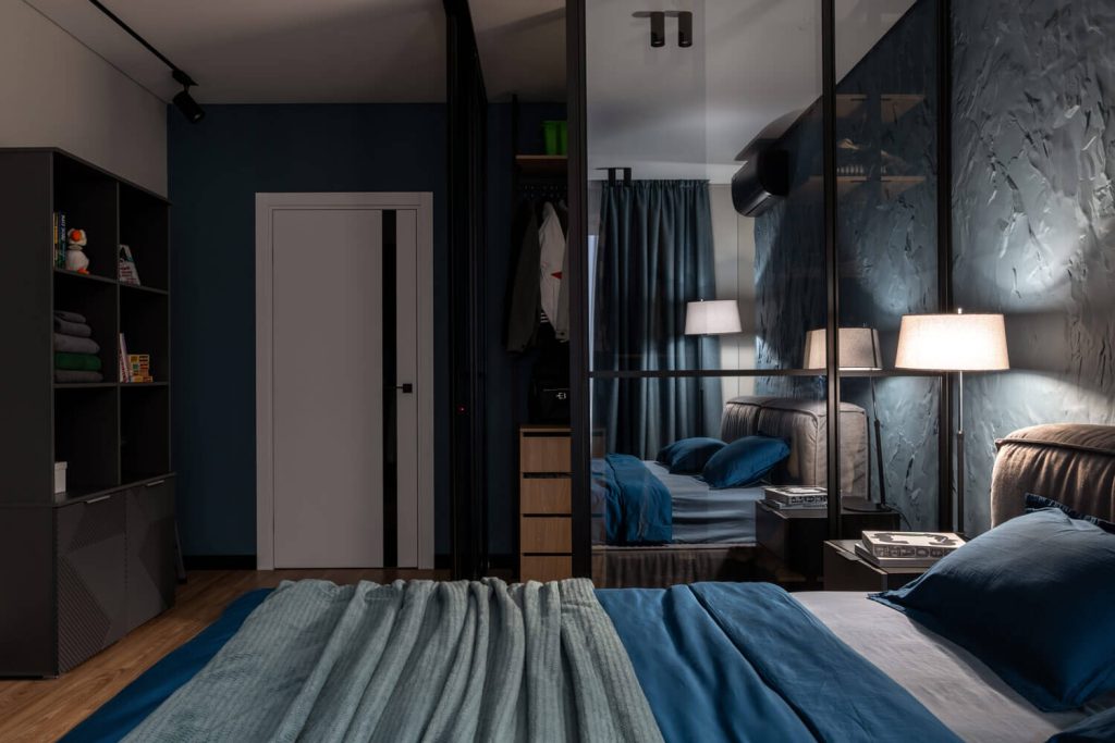 В спальной создать мужскую спокойную атмосферу и предусмотреть место под гардероб с закрывающими дверками, без доступа котика к вещам.